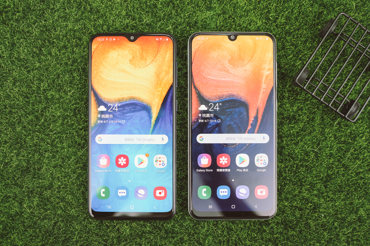 Galaxy A20(左)的主鏡頭為 1300 萬像素/光圈 F1.9 + 123 度超大廣角 500 萬像素/光圈 F2.2。