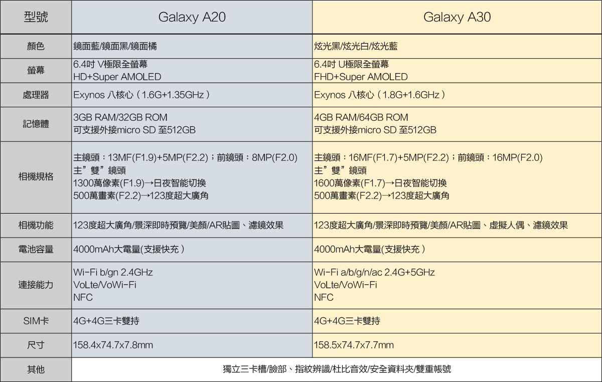 由於 Galaxy A20 和 A30 的規格較相近一些,阿湯也一併提供 Galaxy A20 及 A30 的規格比較表給大家參考,方便做比對,規格各方面都是 A30 略高一些,當然售價也是有差異的,Galaxy A20 為 5,990 元,而 Galaxy A30 為 8,990 元。