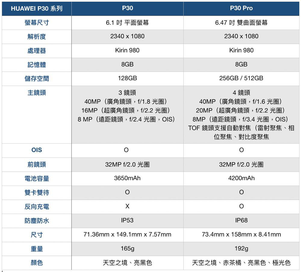 在往下看之前,先提供大家 HUAWEI P30 以及 P30 Pro 的規格比較,基本上最大差異是在 TOF 鏡頭及變焦的能力,不過喜歡手機小一點的話,P30 的手感會比較適合你,因為不論你用哪一支,攝影都很強。