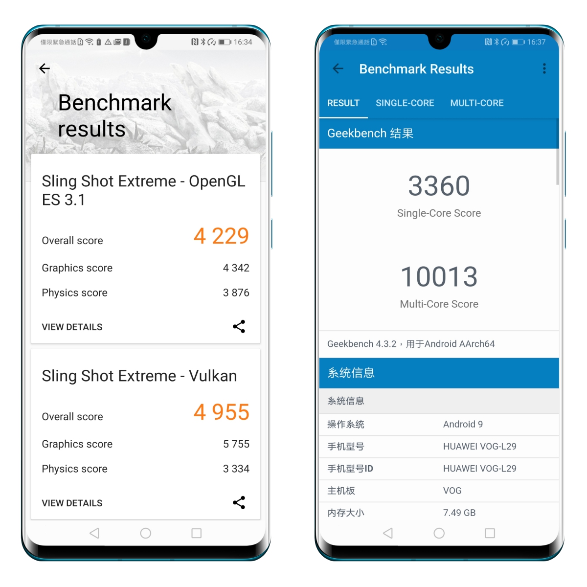 跑分的部份,由於本次 P30 系列均是搭載是 8GB 記憶體的頂規版本,因此我們直接看一般模式與效能模式的跑分。左邊 282,544 分是未開啟「效能模式」,右邊 300,475 則是開啟效能模式所測得的分數,雖然差這二萬算是差很多,不過實際使用起來,以 28 萬來說,市面上所有的遊戲應該只有順暢而已,應該不需要開到效能模式。