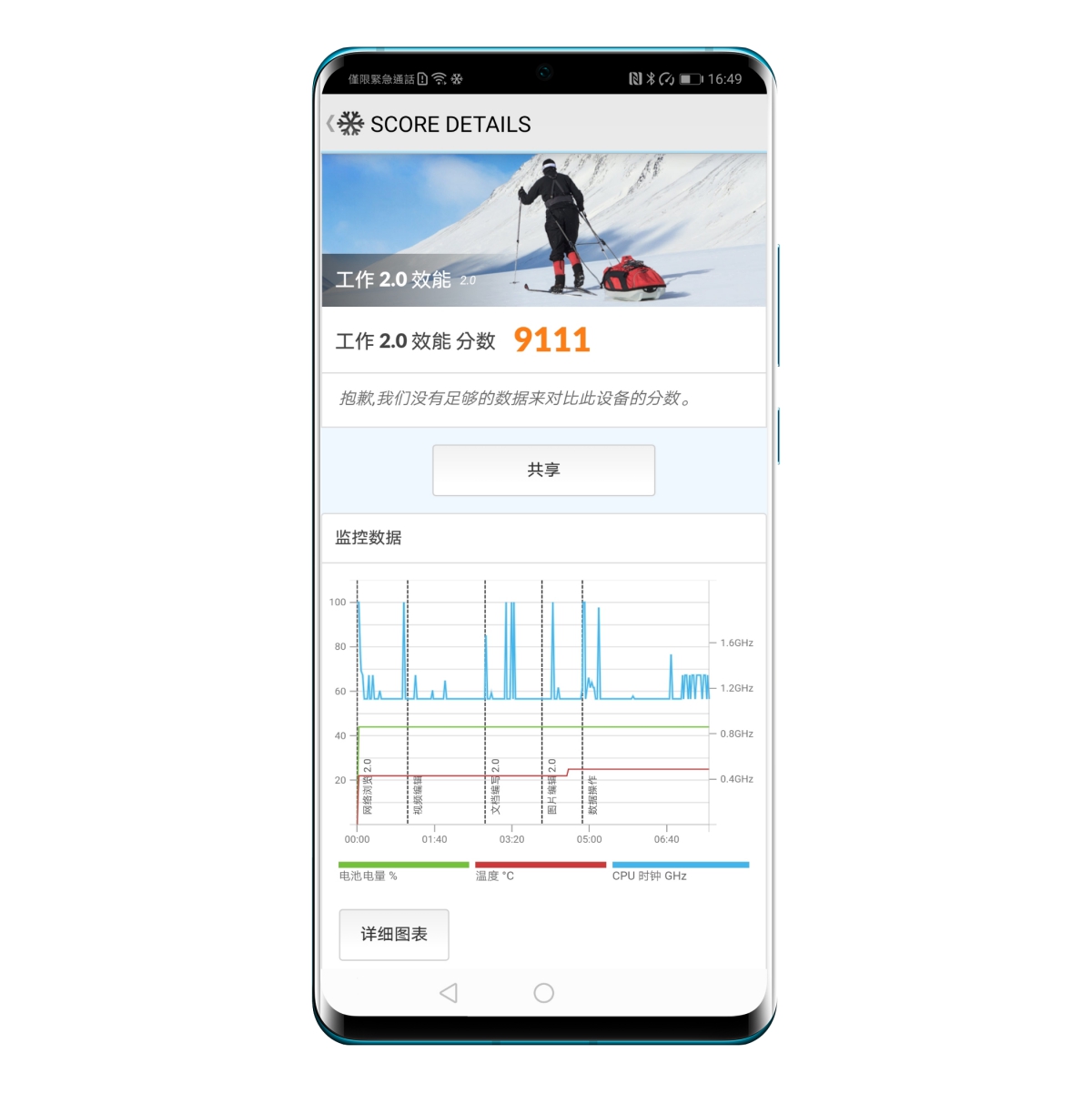 PCMark 測試下,工作效能 2.0 分數為 9,111,而續航的部份,阿湯利用 PCMark 測試完時截圖按錯鍵,但有看到時間是 15 小時 19 分,這續航時間真的非常的長,不得不說華為在系統調校上,讓續航能力大幅的提升,倚靠的並不只有電量加大,用過華為的手機就知道有多省電,阿湯幾乎沒有再帶過行動電源出門了。