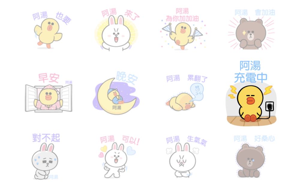 像是輸入「阿湯」,整套的 40 枚貼圖也會變成「阿湯 充電中」、「阿湯 來了」等字樣,是不是貼切的更有趣?