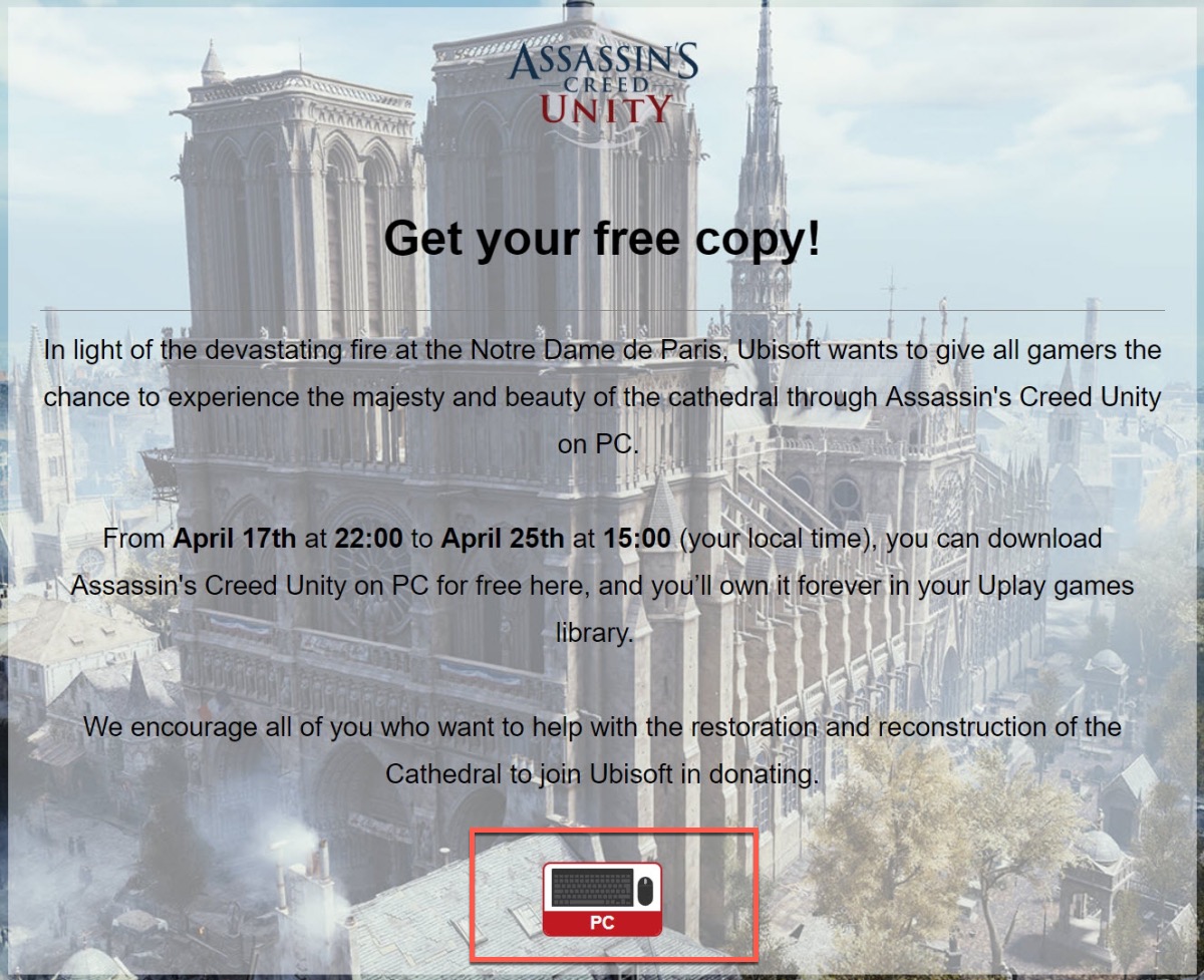 前陣子在國際上非常大的一則新聞就是法國巴黎聖母院發生大火,燒毀的是非常重要的部份建築物,如果有去的的人就知道是付費進入的二樓區域,非常的美,這次災後要修復應該非常不容易,費用應該更是驚人,其實一家遊戲大廠 Ubisoft 就捐贈 50 萬歐元用於修復工作,並且還宣布「刺客教條:大革命」限時免費一週下載,這是一款非常精緻且很好玩的遊戲,阿湯有玩過刺客教條前面的幾部作品,一玩就上癮,反正是免費的,就先取得後,之後有空再玩也行啦。