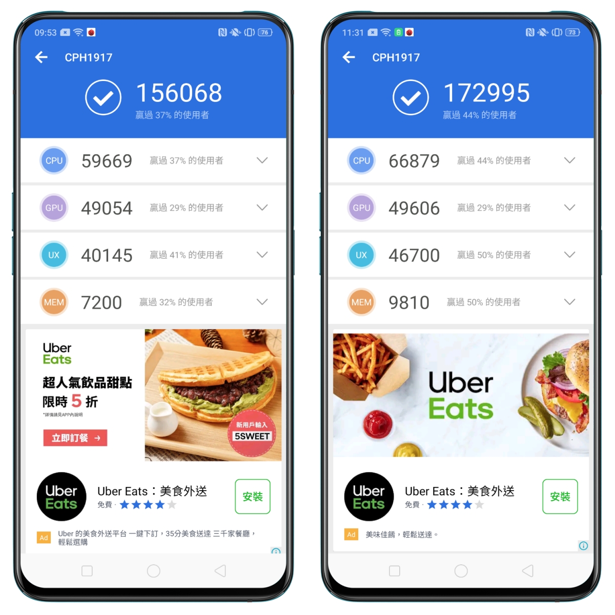 效能的部份,OPPO Reno 是使用 Qualcomm® Snapdragon™ 710 處理器以及 8GB 記憶體,透過安兔兔來測試效能,在自動效能模式下獲得 156,068 分,另外在電池那開啟為高效能模式時,獲得 172,995 分。