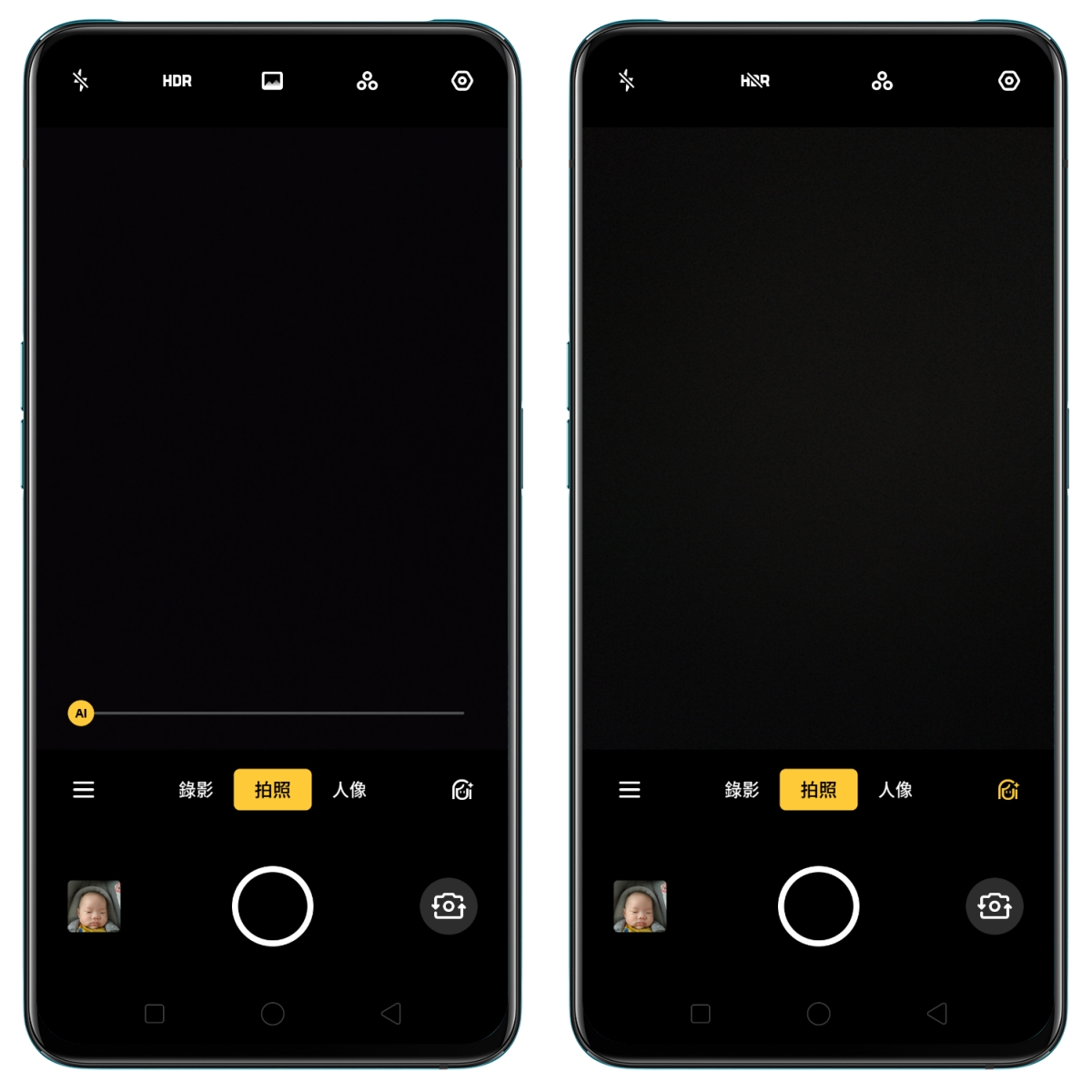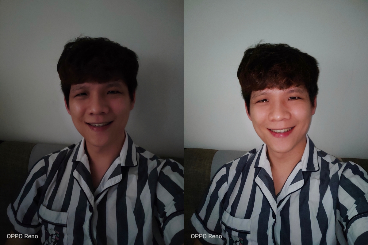 前置鏡頭的補光燈非常的柔和,給大家看一下在暗處拍攝的差異,左圖是沒有開啟補光燈,右圖是開啟後的效果,光線打的非常均勻,不會像一般前置的補光燈打起來很死板或集中在某一點特亮,差異很大吧!昏暗場景或室內要自拍,用力的開啟補光燈吧,不用客氣。