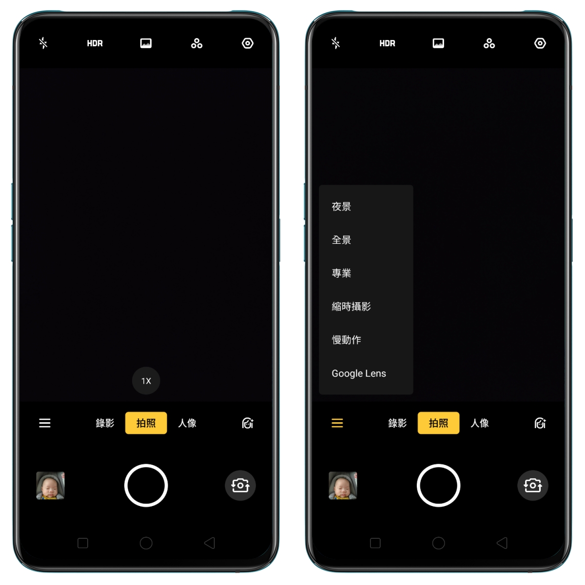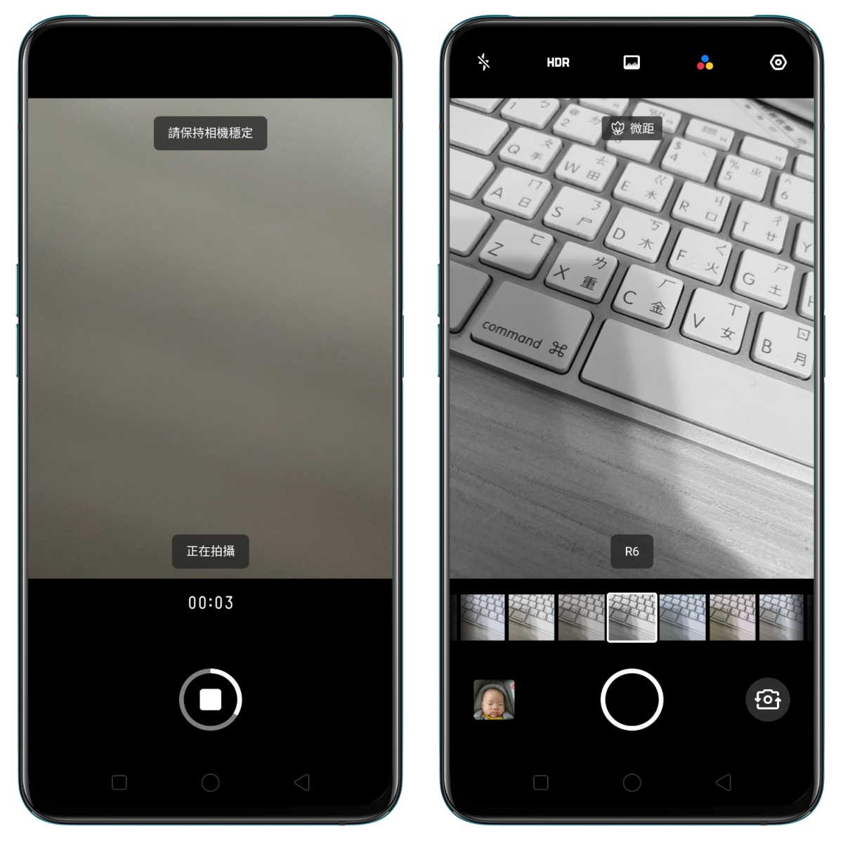 在 ColorOS 6.0 裡,相機介面變的更簡潔,主介面上的功能只有錄影、照相及人像,其他像是夜景、全景、專業、縮時攝影、慢動作等都是放在選單裡,操作起來更加方便。