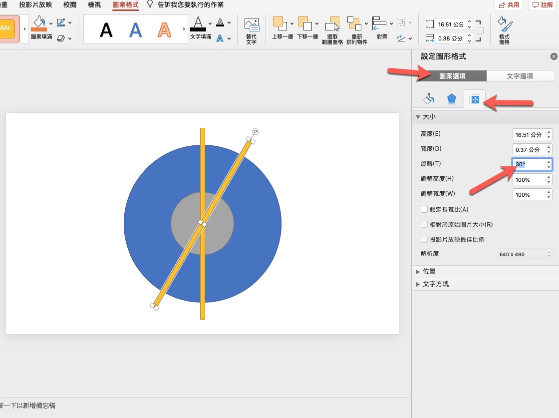 在圖案選項中旋轉 30 度,就會看到第二根矩形變成 30 度的位置。