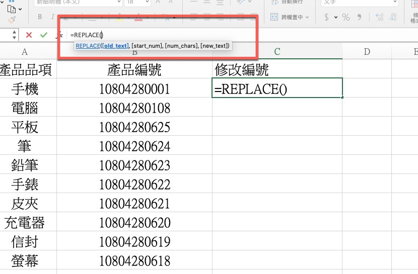 先來弄個最簡單的舉例,我們想要將產品編號中的 108 年開頭修改為 2019 的話要怎麼做?往下來看。
