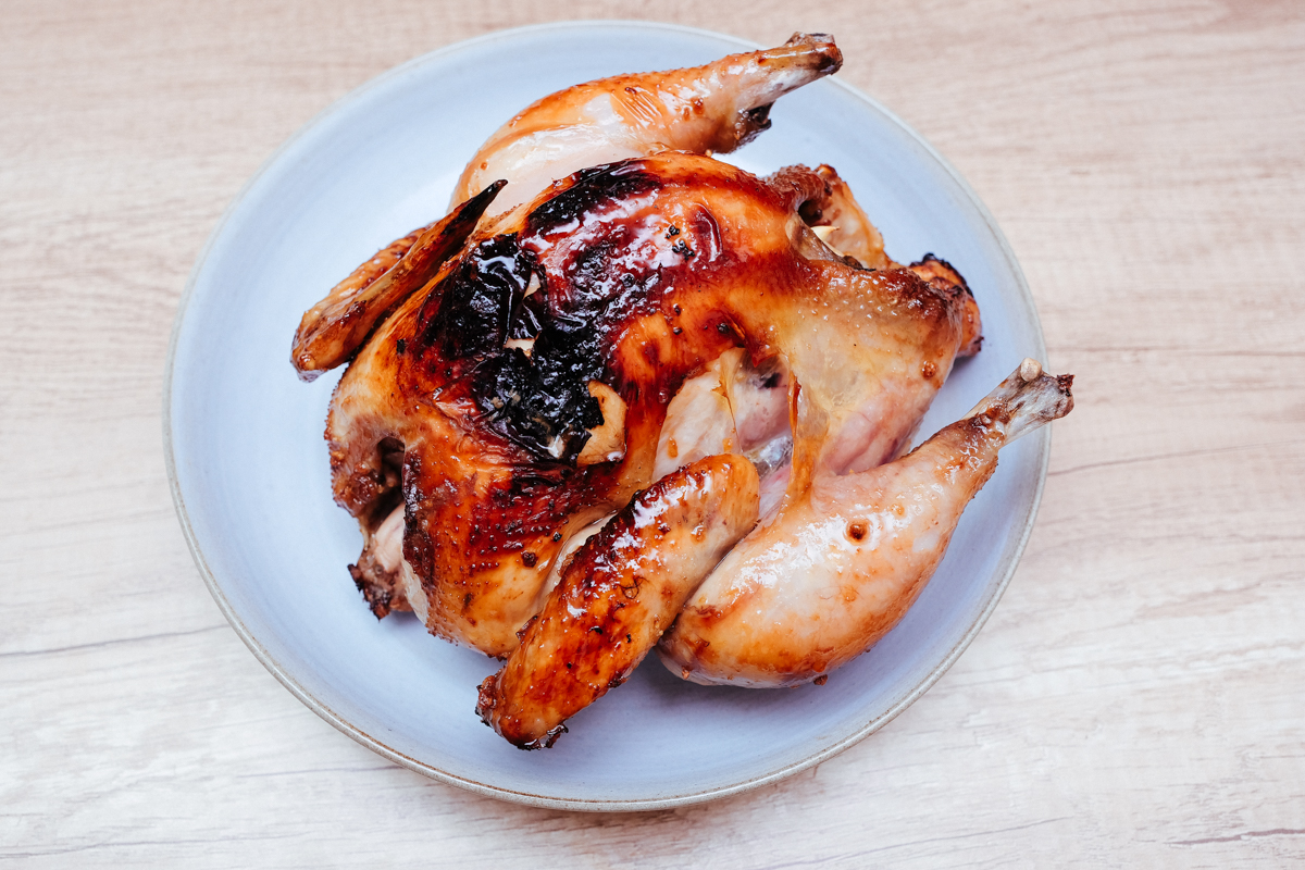 我的做法也很簡單,先用醃料(看你想用什麼,我自己只用了醬油、蒜末、薑末、米酒)醃 24 小時(放進冰箱,適當的翻翻面),然後表面塗一層油後入鍋,先設定 360F,烤 20 分鐘後取出,然後塗一層醃料(會上色比較好看)跟蜂蜜(看個人),然後翻面再烤 10 分鐘搞定,如果雞塞比較滿的,中心點建議放一層鋁鉑紙隔開,才不會皮烤太焦。