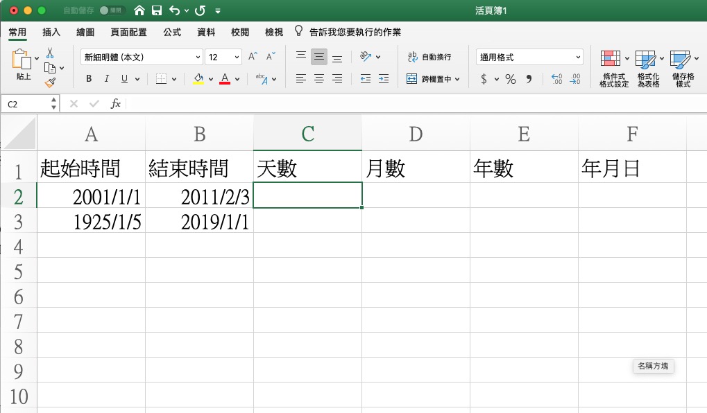 範例是這樣的,有個起始跟結束日期,然後我們要做的是計算天數、月數、年數的差異,最後再加個年月日的差異,往下一一的來解說吧。