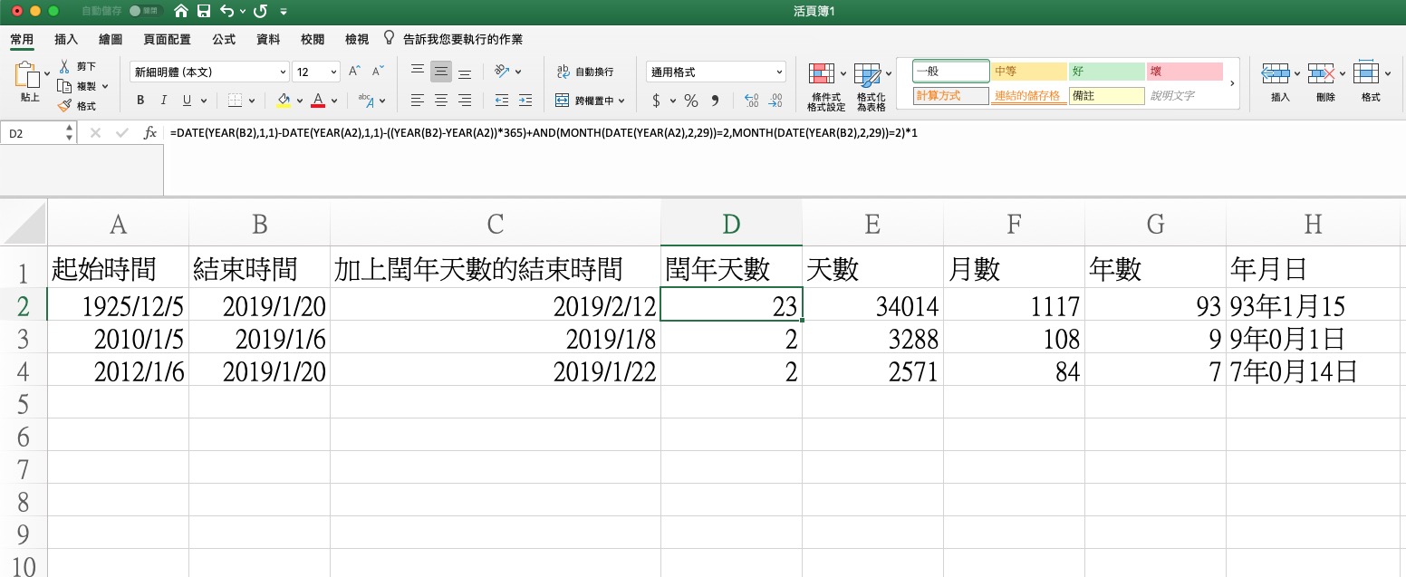 以上的年月日都很簡單,各別的計算都只要一個函數就搞定,但如果是要弄成年月日並存的話,先給大家看一下公式的全部:
