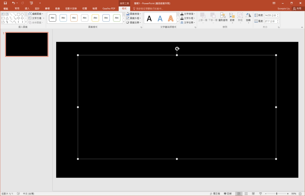 首先我們可以先建立一張黑底的簡報,然後插入一個「文字方塊」。