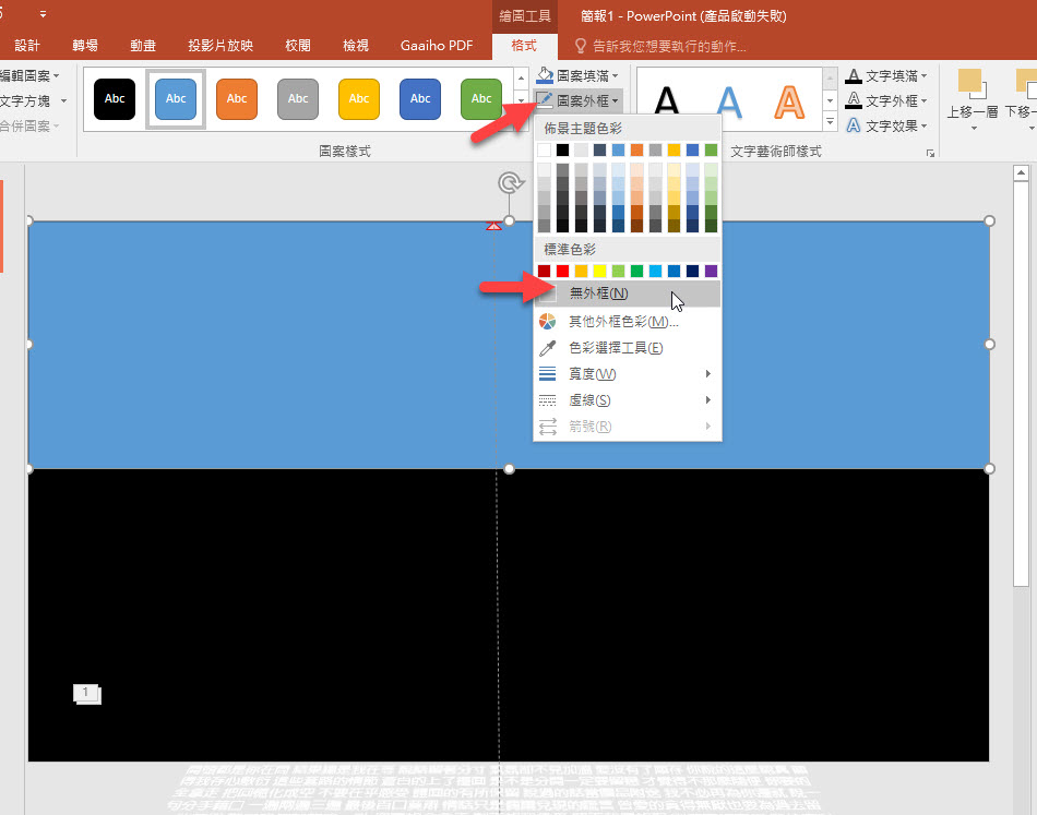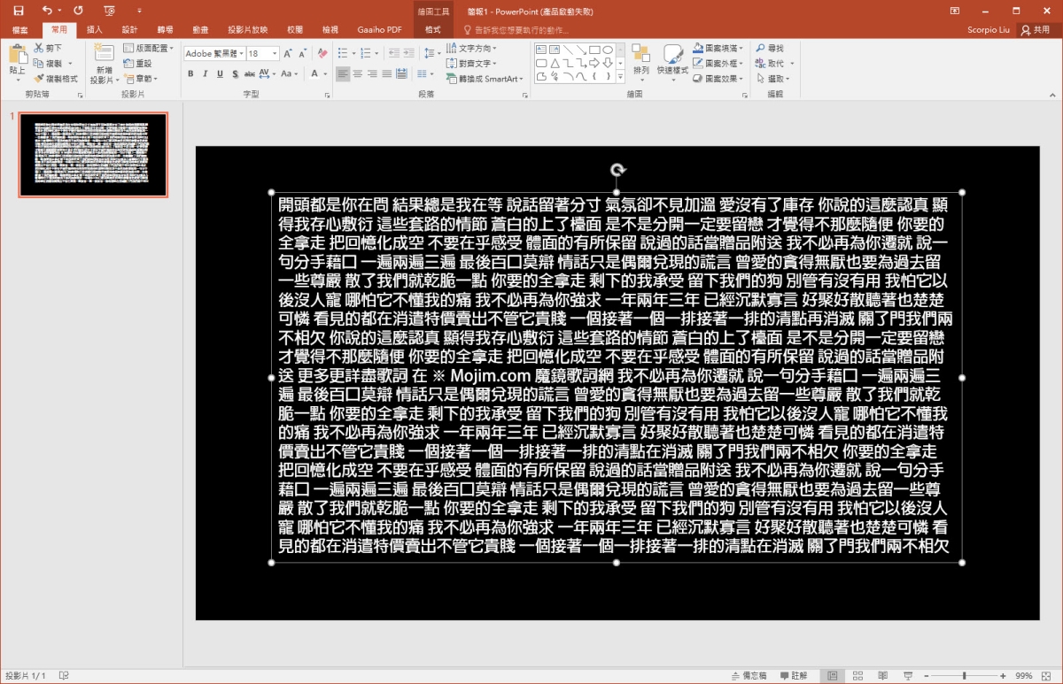 然後將文字方塊往簡報下方拉,讓文字的第一排剛好在簡報範圍的下方。