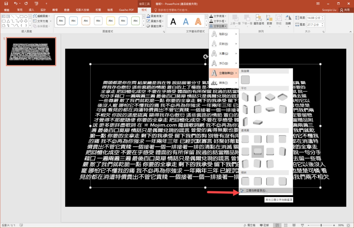 接下來再按一次文字效果 > 立體旋轉 > 選最下方的立體旋轉選項。