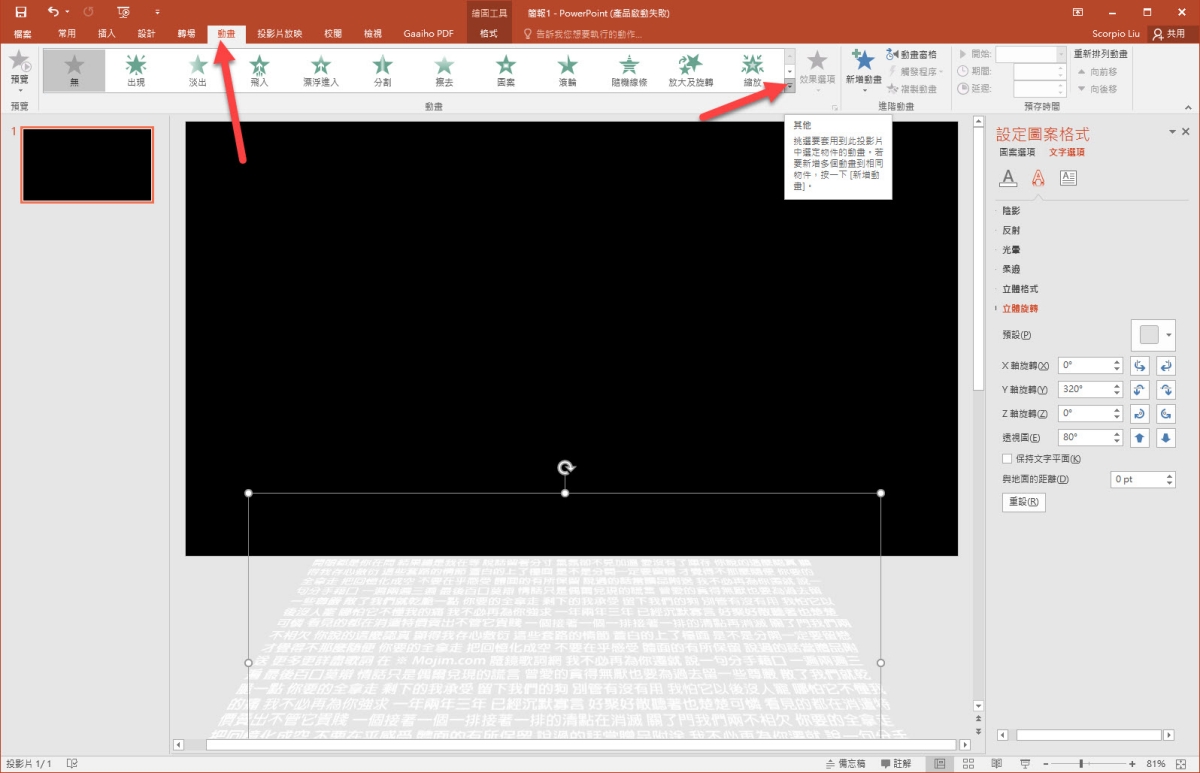 接下來就要幫文字方塊加上動畫效果,我們要做的是由下往上跑,在動畫裡,點擊那個最右下角的其他展開。