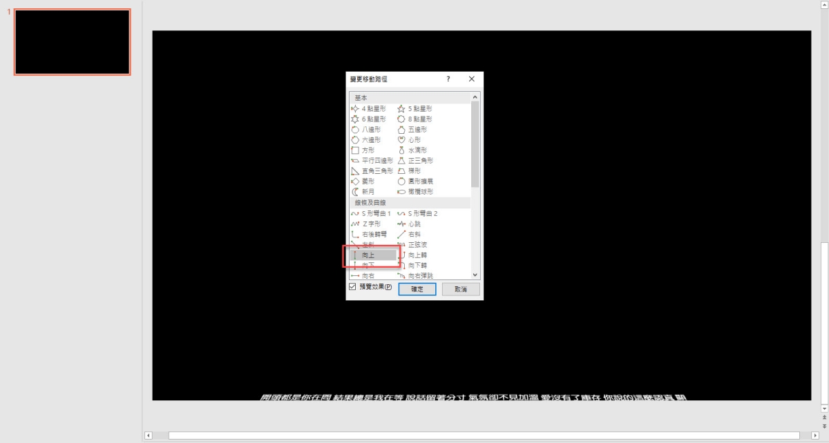 這時就可以點擊最左上的預覽查看一下目前為止的動畫面,確認文字由下往上跑且由大變小。