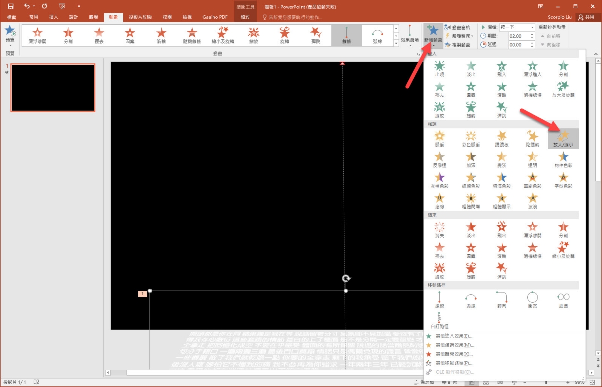 在動畫 > 新增動畫 > 放大/縮小。