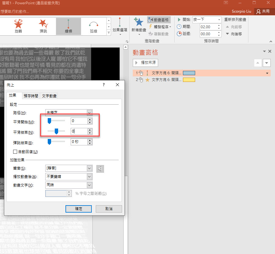 然後點擊進階動畫中的「動畫窗格」,這裡右邊會看到有二個我們前面新增的動畫,一個是路徑由下往上,一個是文字縮放,我們先調整第一個效果選項。