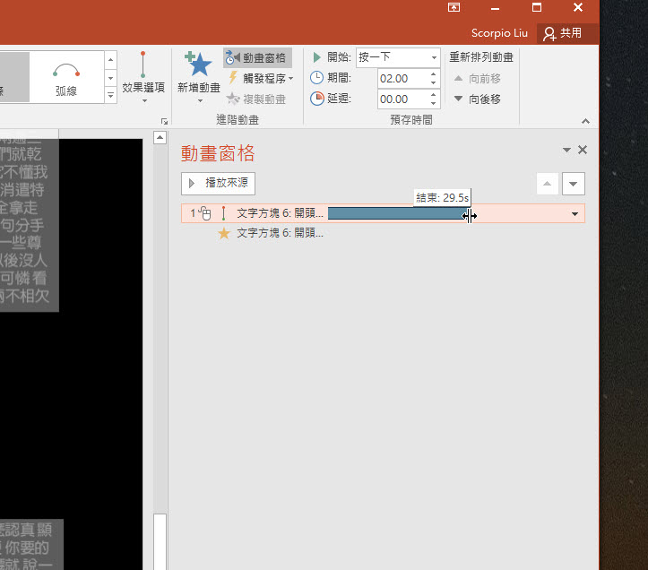 因為預設動畫只有 2 秒非常短,你感受不出差異,我們可以將文字方塊用拉的方式加長時間,建議 15~30 秒應該比較剛好,二個動畫的時間都拉一樣的時間。