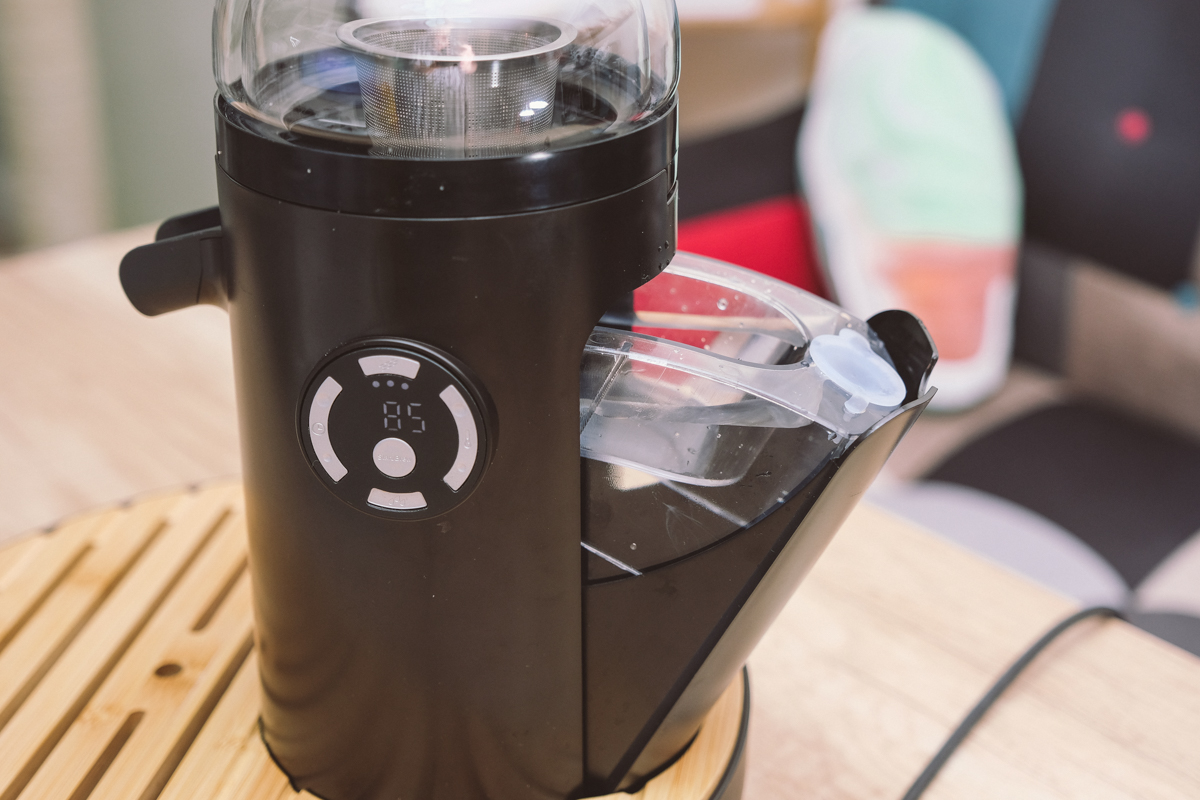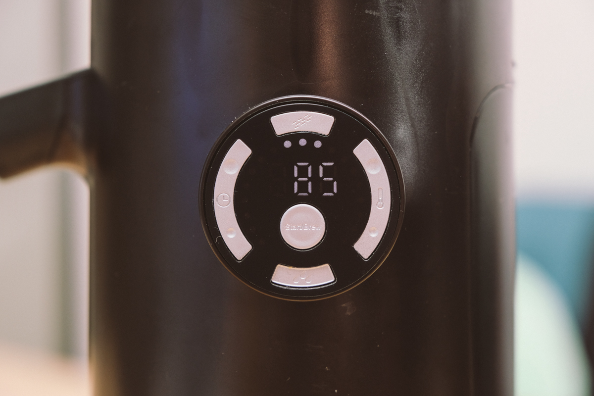 中間是啟動鍵,面板會顯示溫度以及設定的時間,隨著倒數,中間的 LED 燈號也會往內縮減,讓你知道還有多久泡好。