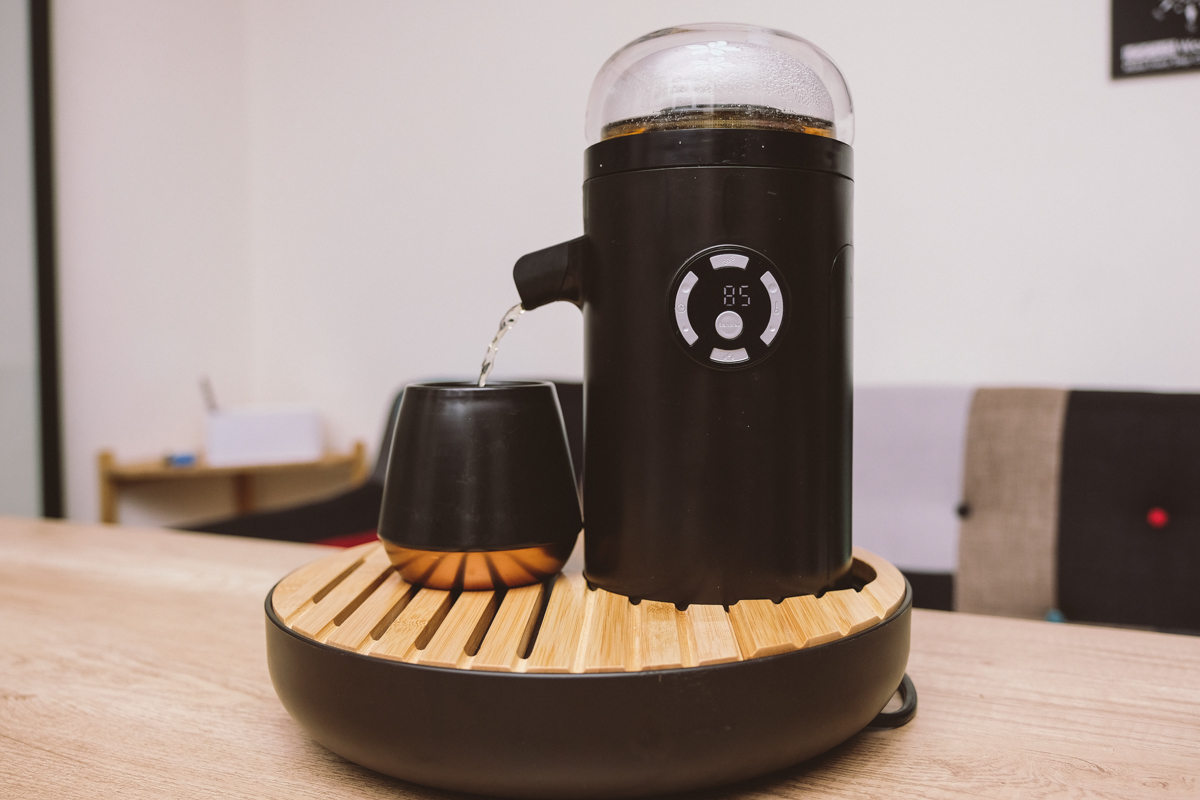 這篇文章不算是正式開箱,阿湯先就目前樣機的使用分享一點心得,首先外型設計的蠻不錯的,在「泡茶」的流程上也蠻順手的,我自己幾乎都是用 APP 泡茶,放茶葉、按一下我就可以去做其他事,因為我固定會把公道杯放在感應區,這樣一泡完就會出茶,也不用擔心茶會泡太久變苦或澀,像我每天早上起床第一件事就是餵湯包喝奶,陪他玩一下後再哄睡他讓他回籠覺一下,其實根本沒時間吃早餐,更不用說泡杯熱茶來喝,最近變成是餵湯包喝奶的期間,我就透過手機按一下泡茶,搞定這件事,方便很多。