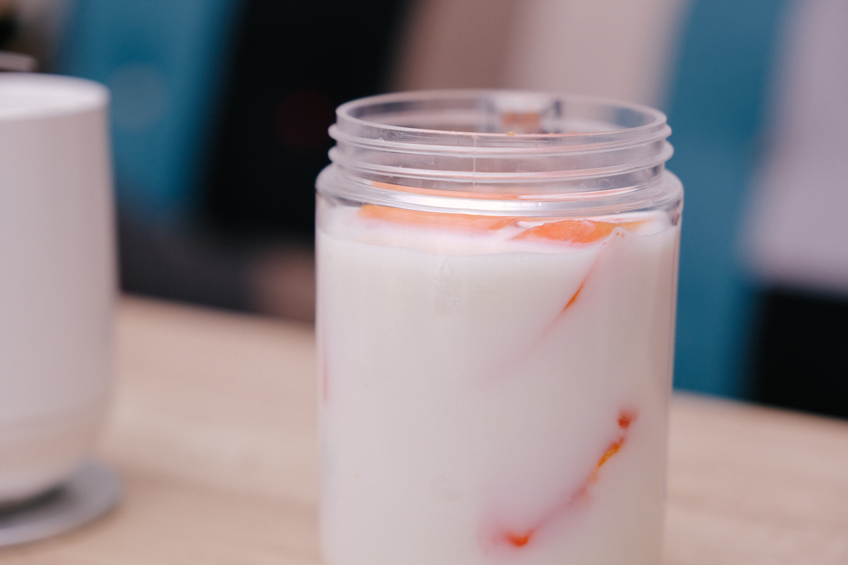 跟大家講一件很神奇的事情,一整盒的木瓜丟進去,再加一罐最小罐的鮮奶,剛好就在 Max 線,怎麼可以這麼剛好?跟便利商店談好的嗎...