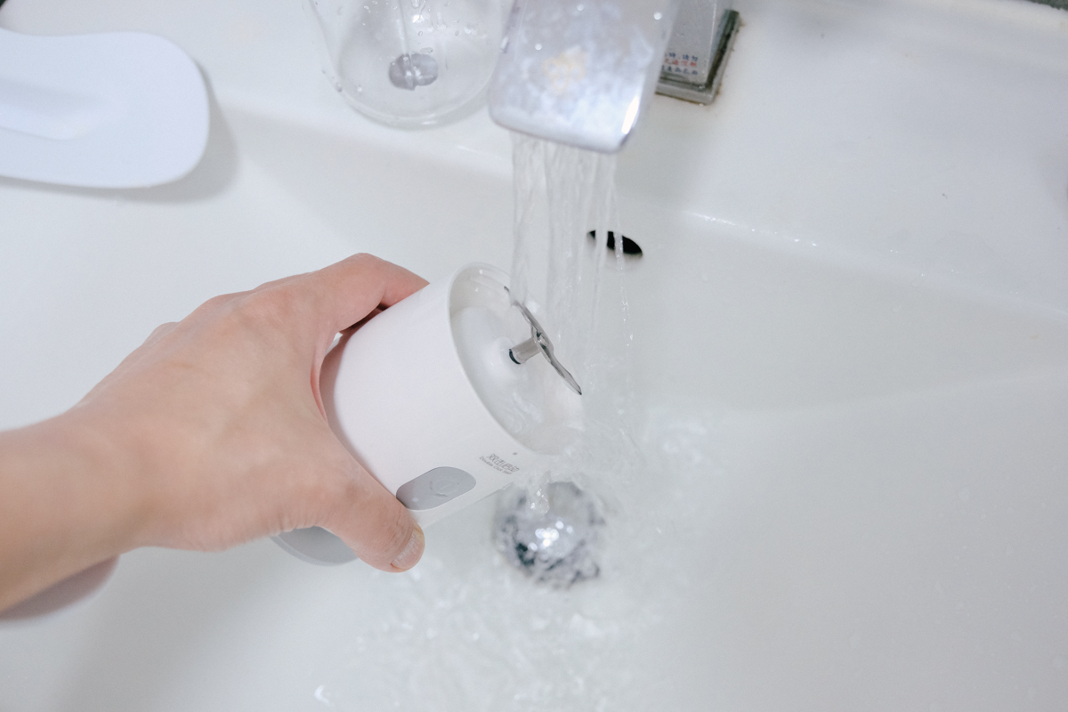 這是一個好問題,我買的時候有想過,拿到時發現杯子其實不深,一般來說,你可以先加清水運轉沖洗一下,然後就可以去洗手台沖一沖,其實就蠻乾淨了,只要你不要打任何有油脂的東西應該都很好沖洗,反正便利商店大多都有洗手台可以用。
