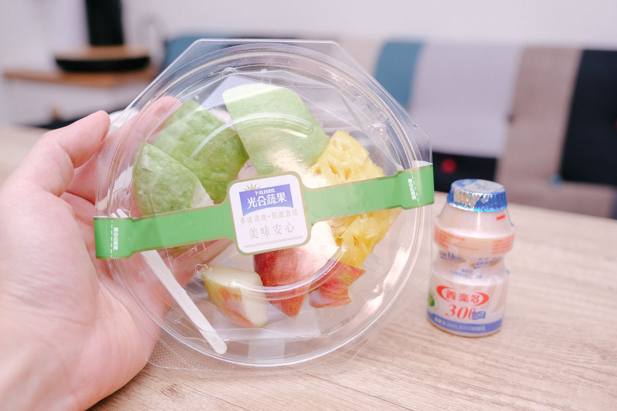 再來是在 7-11 最容易買到的綜合水果盤,每個季節可能會有點不同,像我最近去買是芭樂、鳳梨跟蘋果,如果你不想喝牛奶(像我就乳糖不耐症),可以跟我一樣,改加多多進去。
