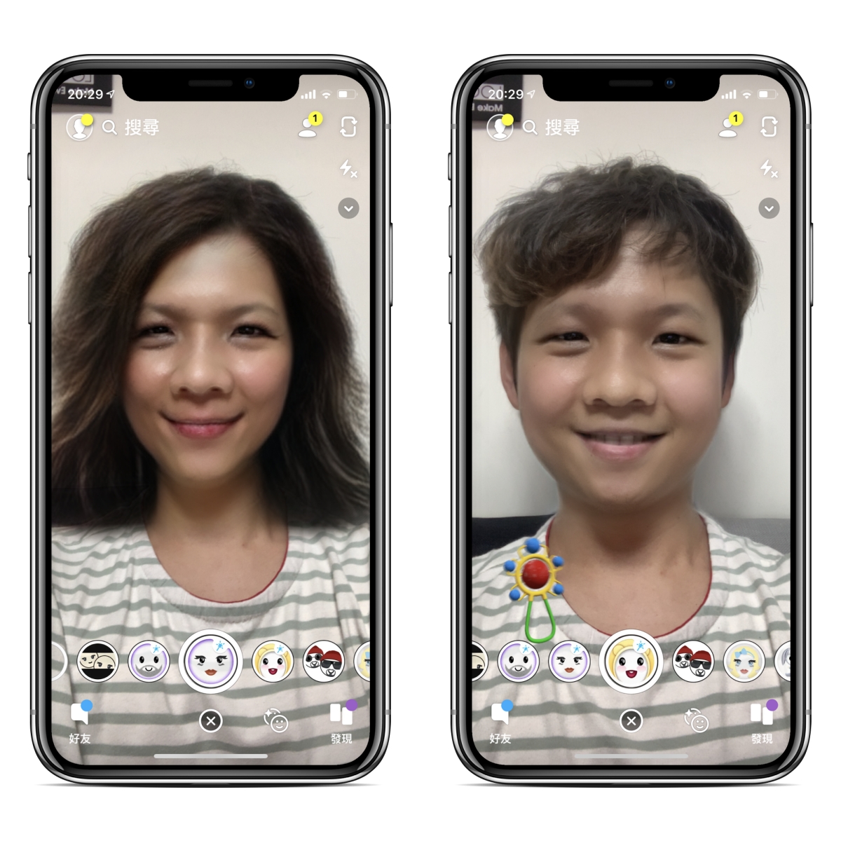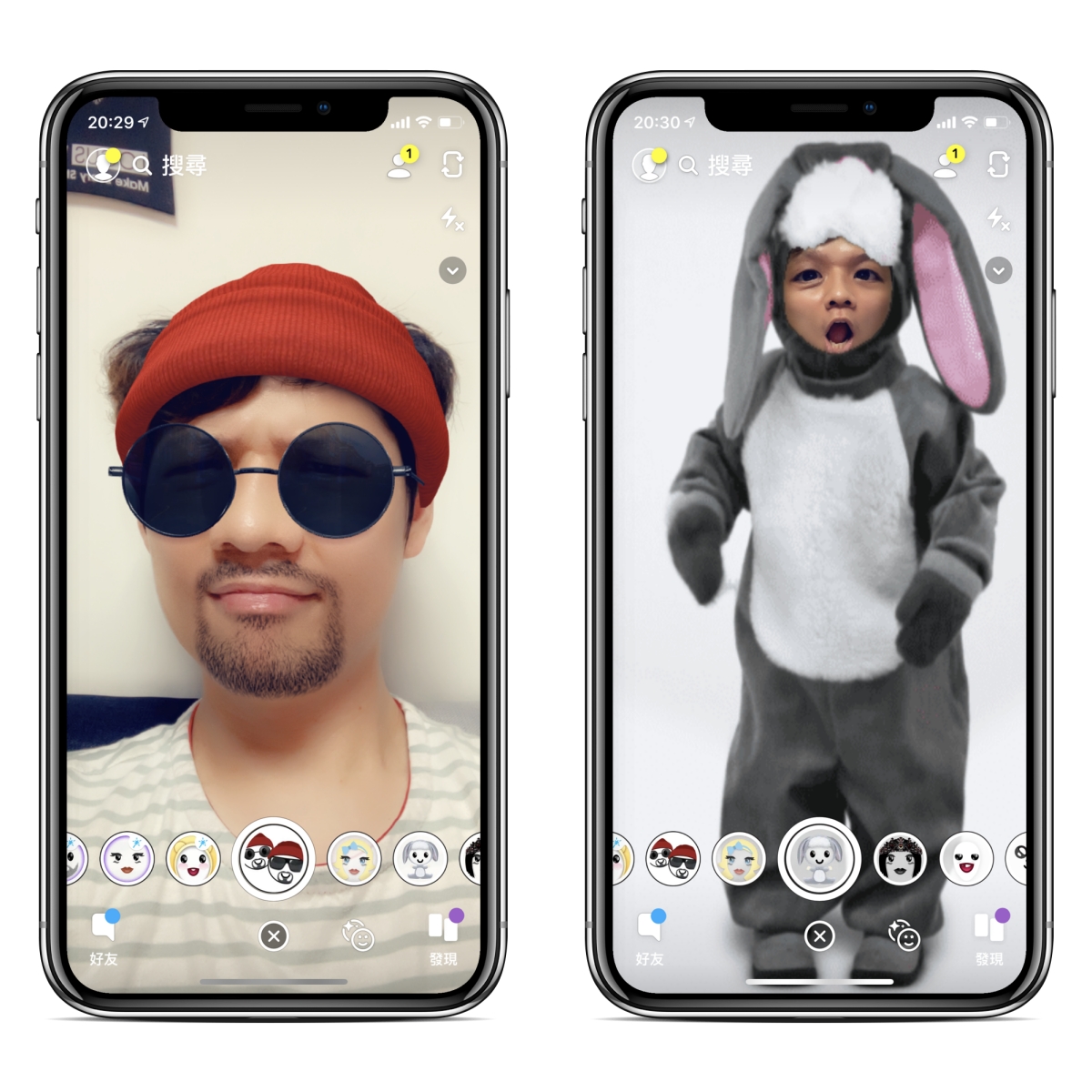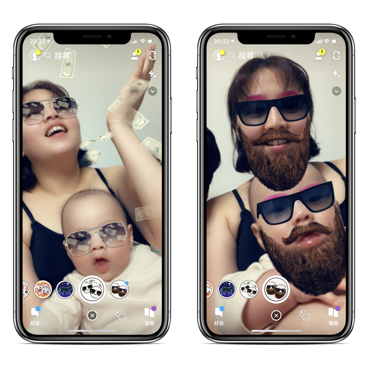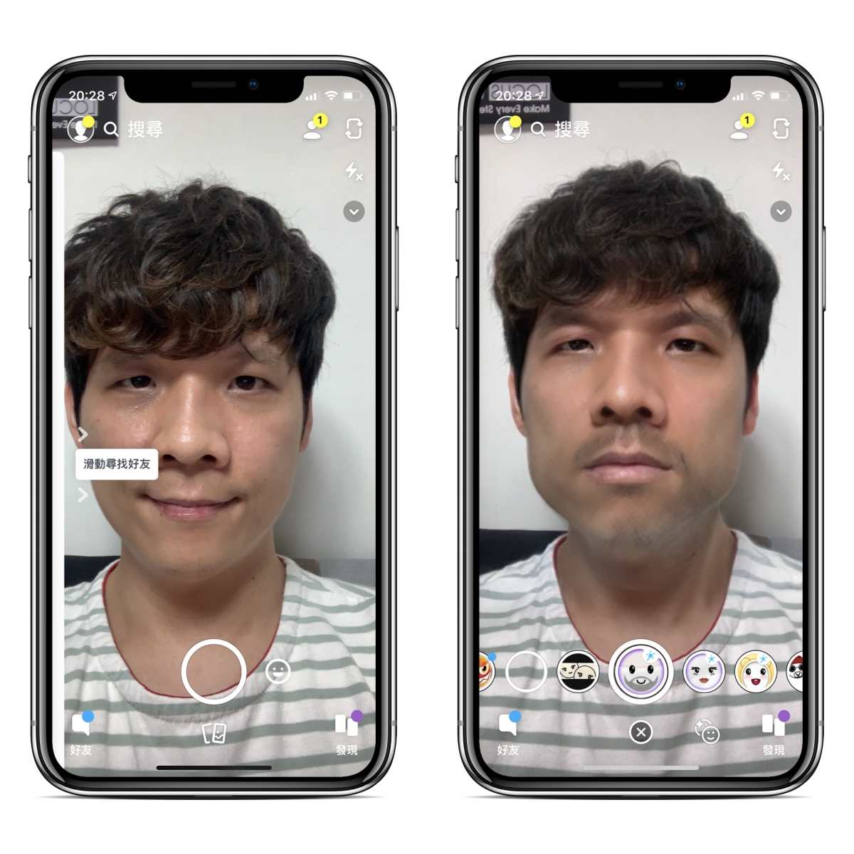 這 APP 需要註冊登入,我就不多介紹,直接來進入主題,右上角可以切換前後鏡頭,然後在下方快門鍵右方有個小臉,按了之後就可以選擇要變臉的效果了,比如像這是很多女生會選的變成鬍渣男,阿湯身邊還頗多女生變成男生後變型男啊。