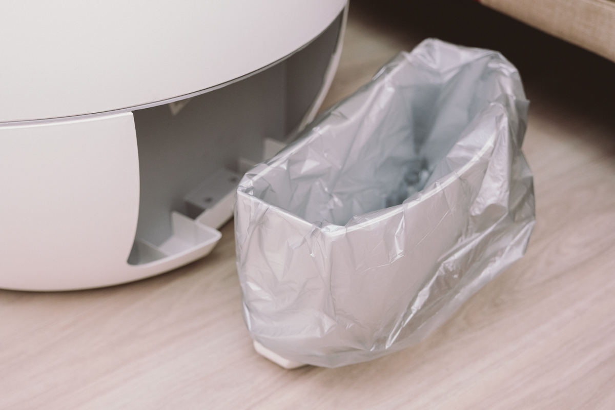 以我家二隻貓的砂量,估計是 4~5 天需要換一次垃圾袋,另外這台有個小缺點,集砂桶滿的話不會停止運轉也沒有通知,所以你要自己定期的檢查更換,太空艙那台是有滿砂停止的機制,而且前方號誌燈會亮紅燈,就知道該換袋子,我覺得這是二台的最大差異處。