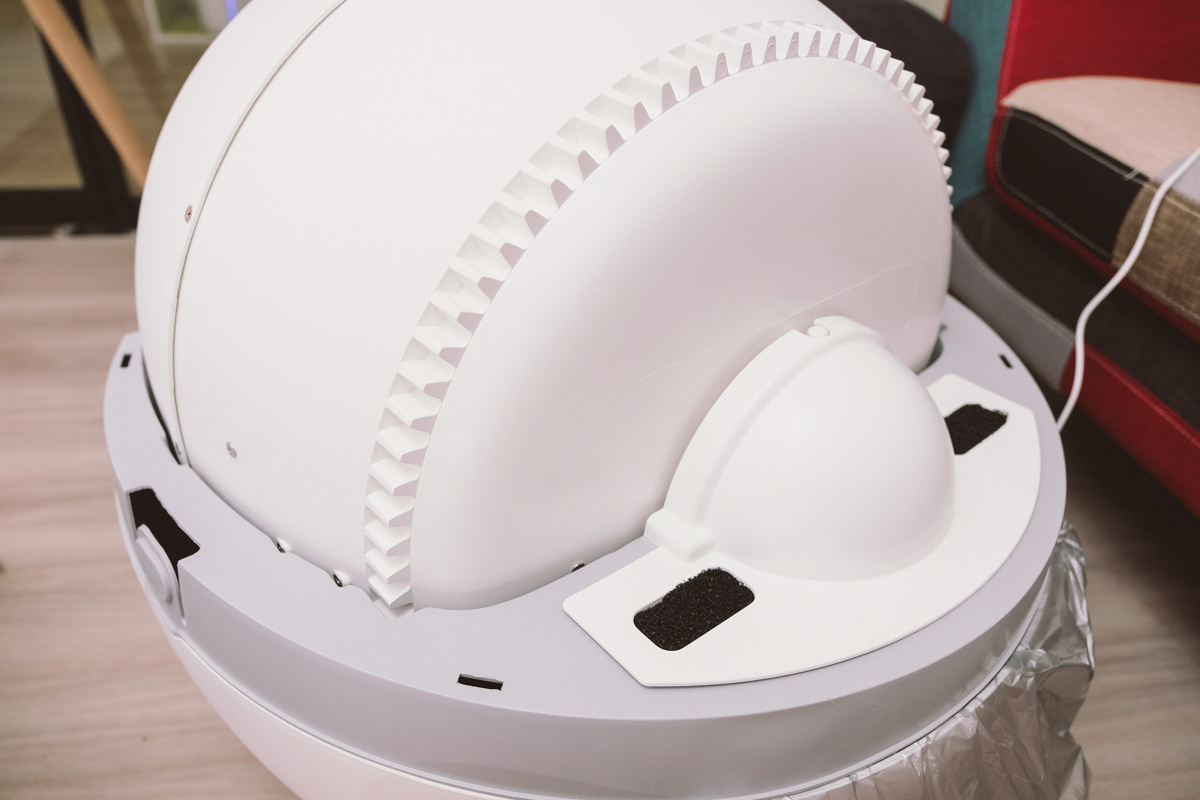 順便說明一下,喵星人太空艙同樣在貓進入時會自動停止,但有一個很大的設計差異,太空艙的集砂桶在底部,所以當運作時停留在落砂的底部開孔時,喵咪是可以挖到下層的落砂桶的,有一次我家的貓就把底部垃圾袋全弄破了(我超傻眼),但只有 2~3 次。