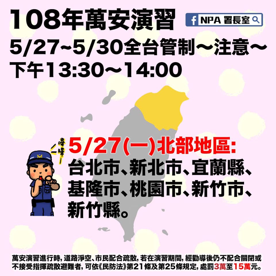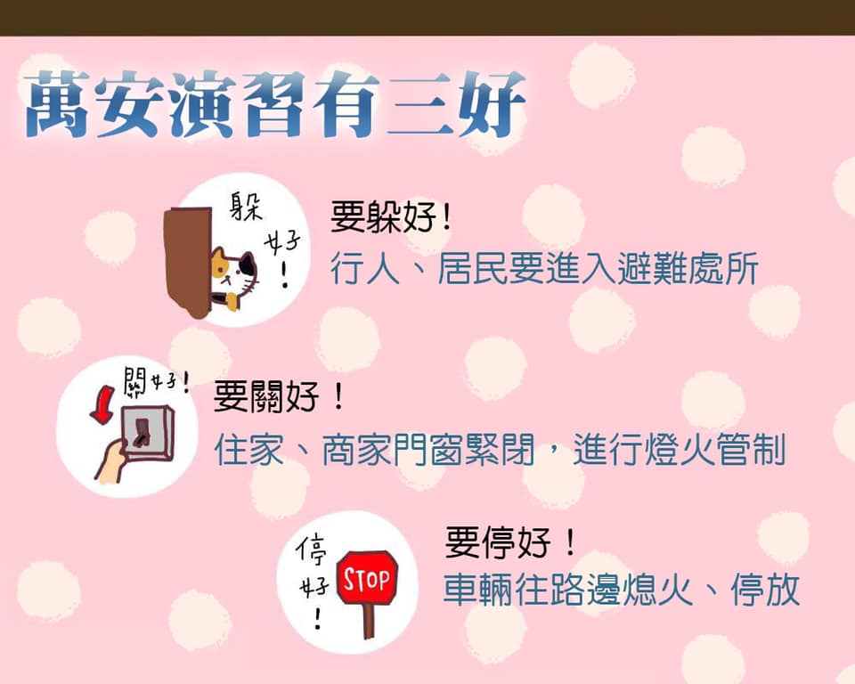 「NPA 署長室」也提醒演習期間,當防空警報響起,路上行人、行駛車輛都要立即停止動作,行人、居民都要進入避難處所。住家、商家門窗緊閉,進行燈火管制。車輛靠路邊熄火、停放。
