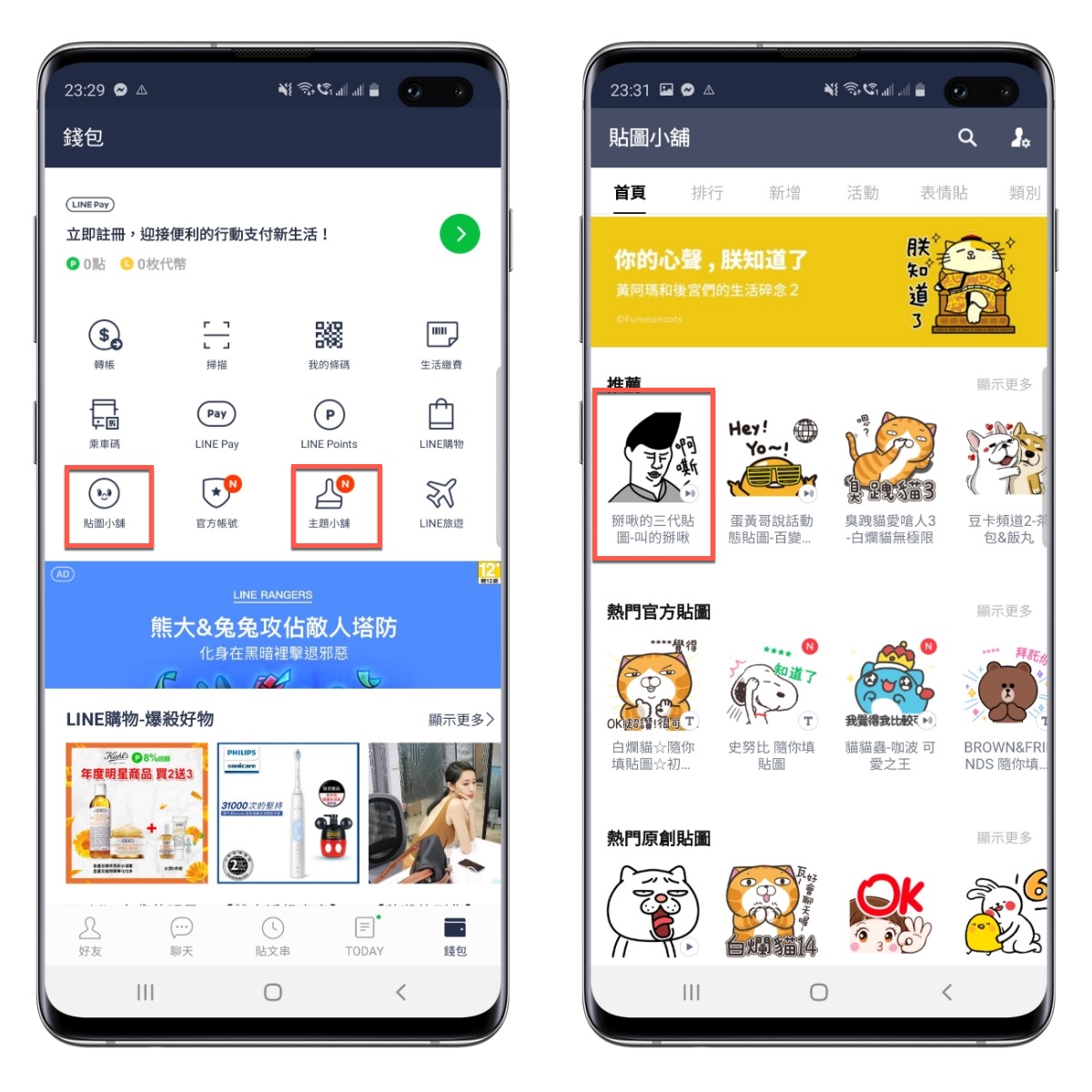這招不論是 Android 或 iPhone 都適用,首先進到你的錢包,然後進入到貼圖小舖或主題小舖皆可,阿湯這邊以貼圖小舖來做示範,進入到貼圖小舖後先隨便選一個貼圖進入,比如我選了第一個。