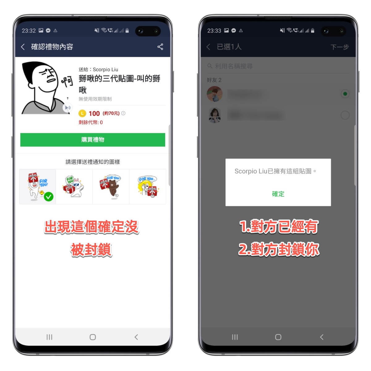 - 已經擁有貼圖(或無法贈送):對方已有貼圖 or 對方封鎖你