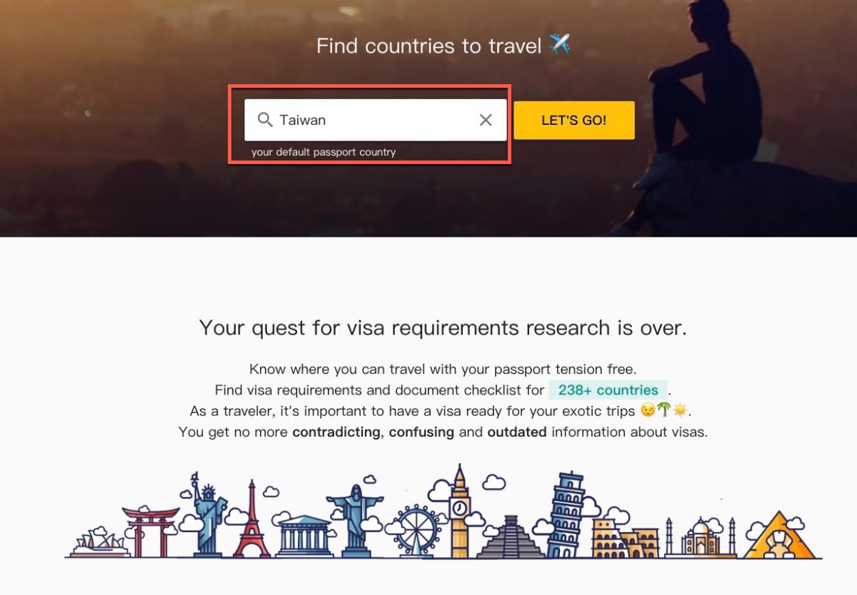 Visa List 網站後,直接在輸入框中填上要查詢的國家(你持有的護照國家),比如我們是台灣,就填入 Taiwan,按下 Let's Go!