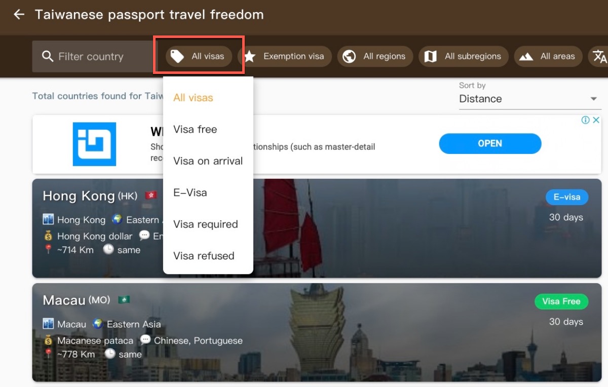 如果你常在亞洲地區旅遊應該比較沒注意,因為持台灣護照在鄰近熱門的旅遊國家日本、韓國是免簽證的,而去大陸跟香港則只要有台胞證也可以,但像是美國或東南亞的泰國、越南等,都是需要簽證的,各別需要的簽證種類也有所不同,當然,如果是透過旅行社代辦,這些都是付錢就解決的,但如果是自由行還要自己注意一下簽證這件事,那麼,要怎麼查看去哪些國家免簽證,哪些需要電子簽證或落地簽,以及有效期限呢?我們可以透過 Visa List 這個網站快速來查詢。