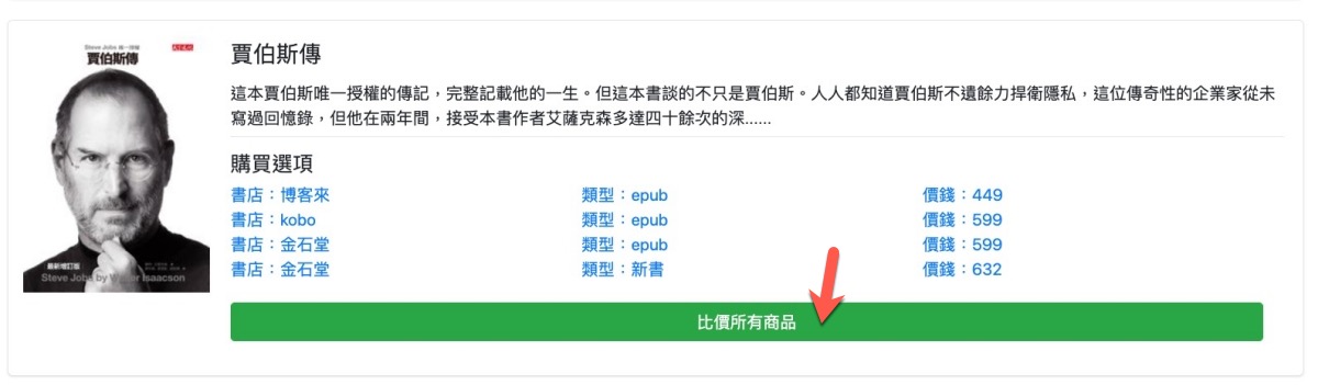 再來搜一下我已經買過的書,分別在博客來、Kobo 樂天以及金石堂都有,但光是電子書的價差居然就有 449 跟 599 的差異,至少差了 150 元,很多啊,我們可以點擊比價所有商品進入查看。