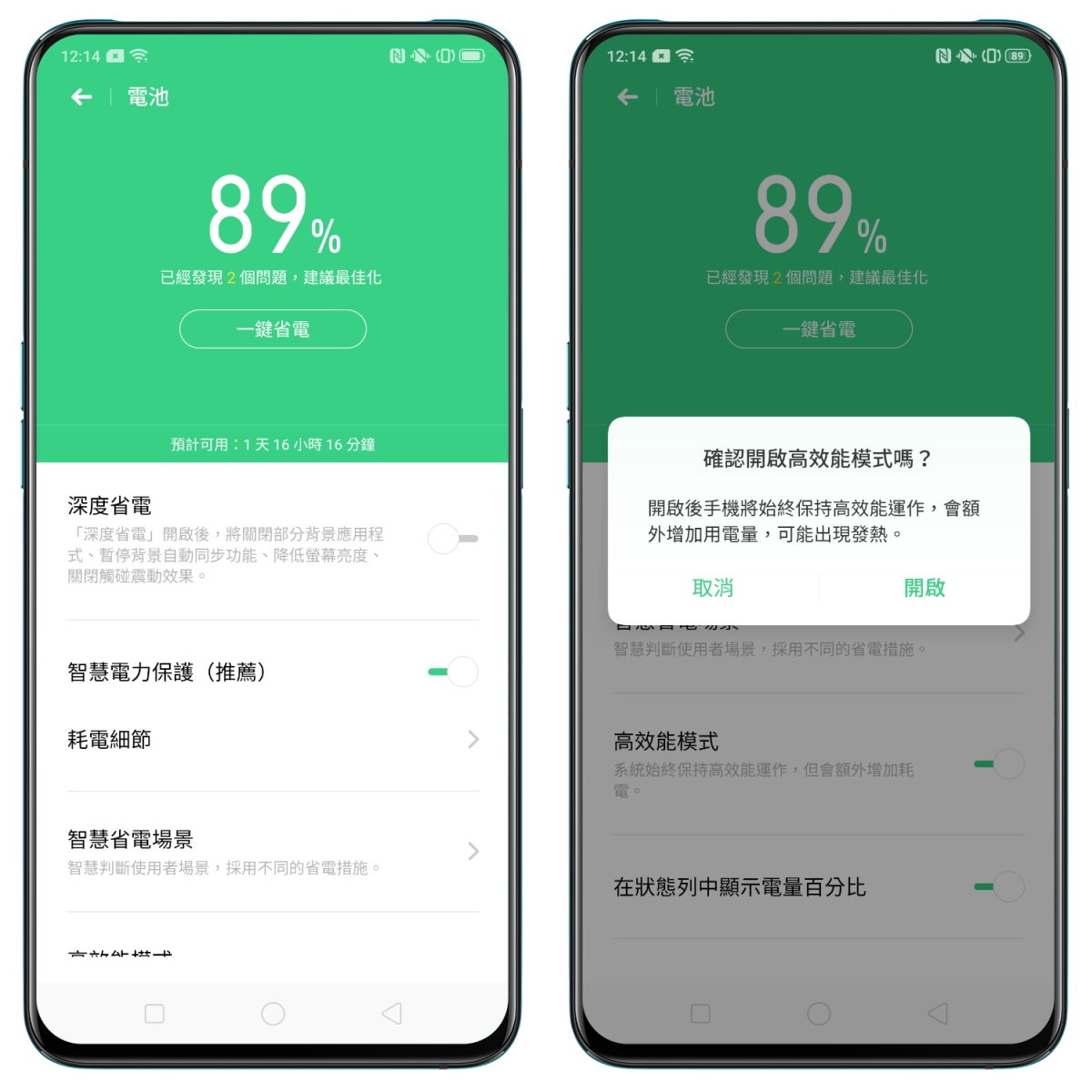 在電池設定中,如果你需要高效能運作的話,可以開啟高效能模式,會讓手機保持在最高效能,機身也會偏熱一些,但不用擔心當機,OPPO Reno 是採用三重散熱技術,透過疏熱凝膠、三層石墨以及銅管液冷的技術,長時間使用也不用擔心過度發燙的問題。