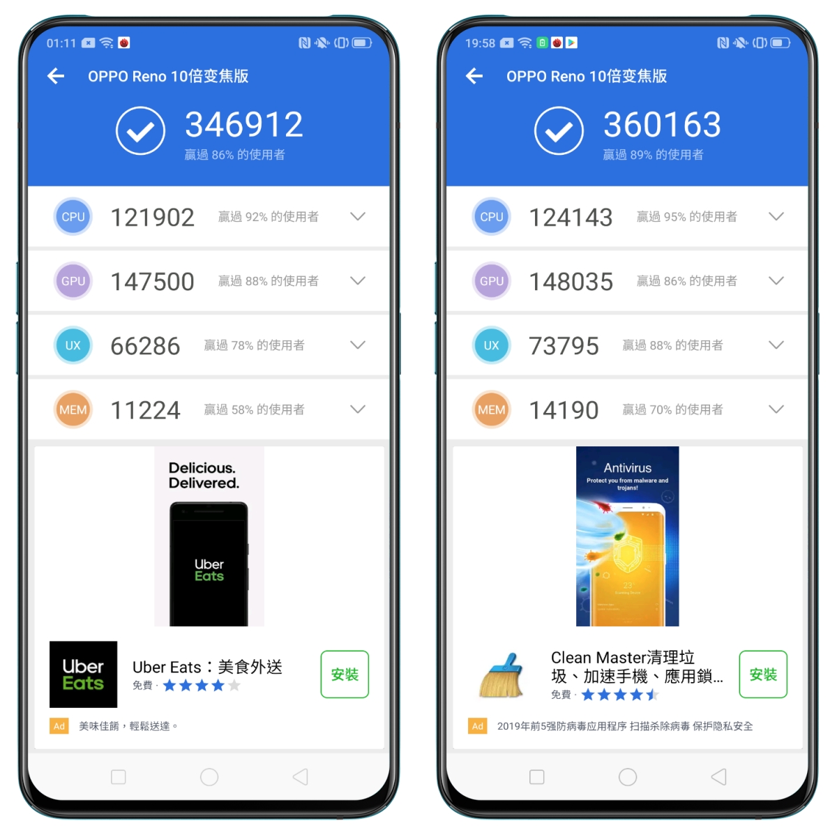 搭載 Qualcomm® Snapdragon™ 855 處理器的效能自然不在話下,阿湯也利用安兔兔測試了效能,下面分別有二個分數結果,左圖為一般預設下使用的效能跑分(346,912),右圖為電源選項中開啟為「高效能」模式所測得的分數(360,163),以目前的手機使用來說,只要超過 30 萬分,所有的遊戲、APP 等,「絕對」都是順暢的,除非你的手機系統沒調校好。
