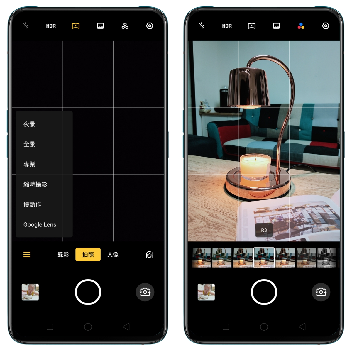 前方之所以稱為「柔光燈」當然是有其原因的,左邊照片是在暗房中沒有開啟柔光然自拍,可以看到房間真的很暗,以往前置鏡頭補光,普遍要柔和一點就是使用螢幕補光,不過螢幕補光有個小缺點是,距離稍遠一點的話就會變的很暗,相對畫質也會變差,而 OPPO Reno 則是搭配專用的柔光燈,補光後(右圖)的效果非常的柔和,不會有強光的邊緣感,且光感很均勻。