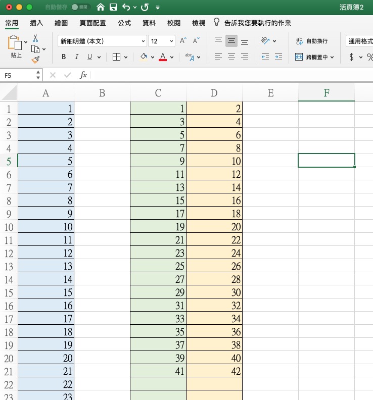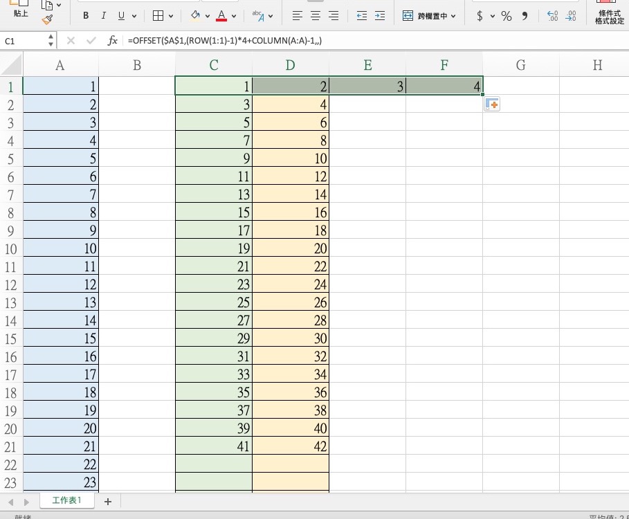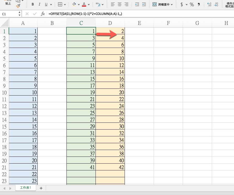 先給大家看一下,這就是有人問我的,假設原本在 A 欄資料是 1、2、3、4、5、6 .... 然後,要將這一欄資料拆分到 C 跟 D 欄位中,應該看圖就懂我們要做什麼,目前該網友是使用手動複製貼上的方法,但如果有一千筆的話真的會死人吧,往下來看怎麼做。