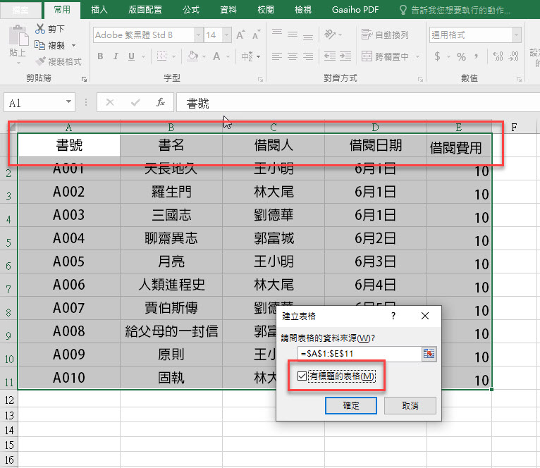 全選你的表格內容後,按下「Ctrl + T」,然後勾選有標題的表格(如果有標題的話),按下確認。