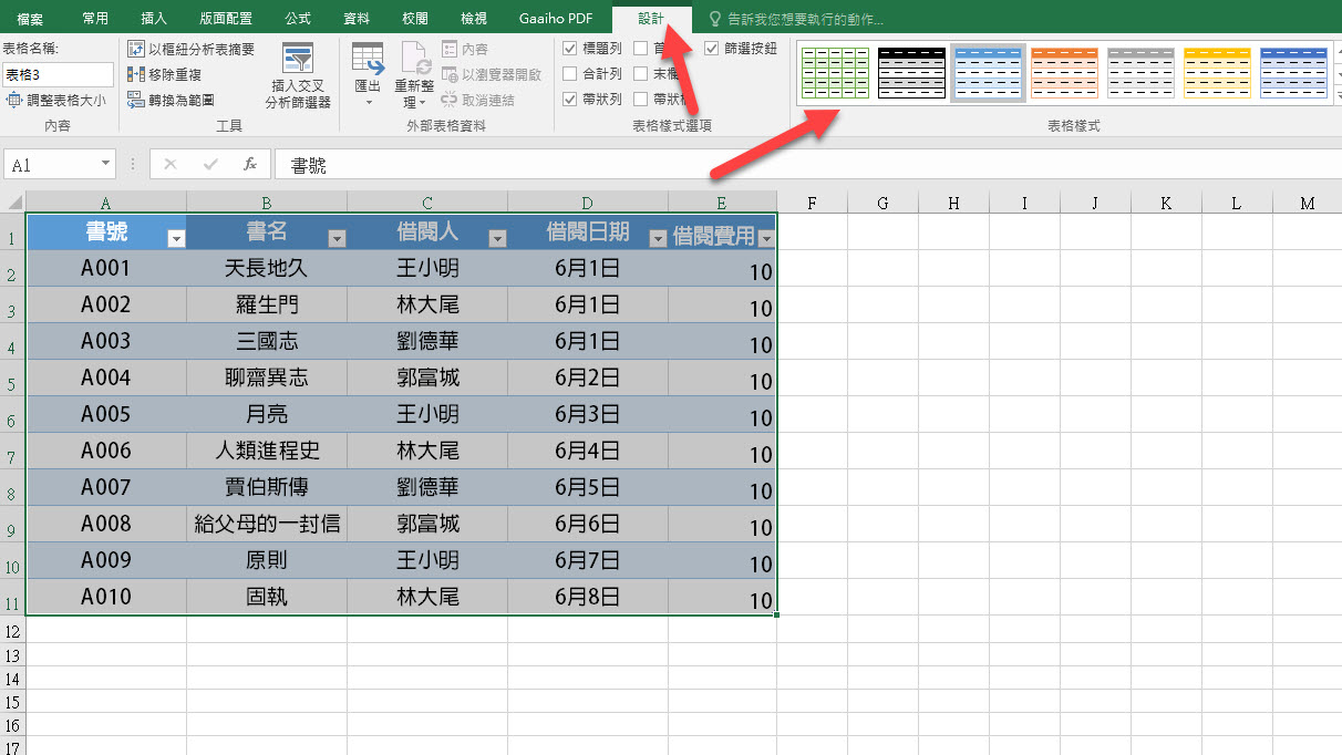 如果你想要變更表格的顏色配置,可以點擊表格任一欄位後,在上方的設計裡變更表格樣式。