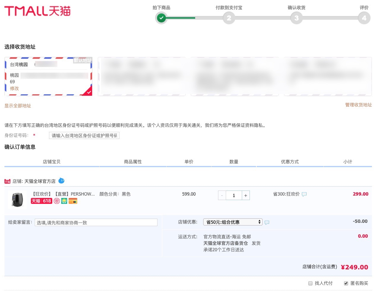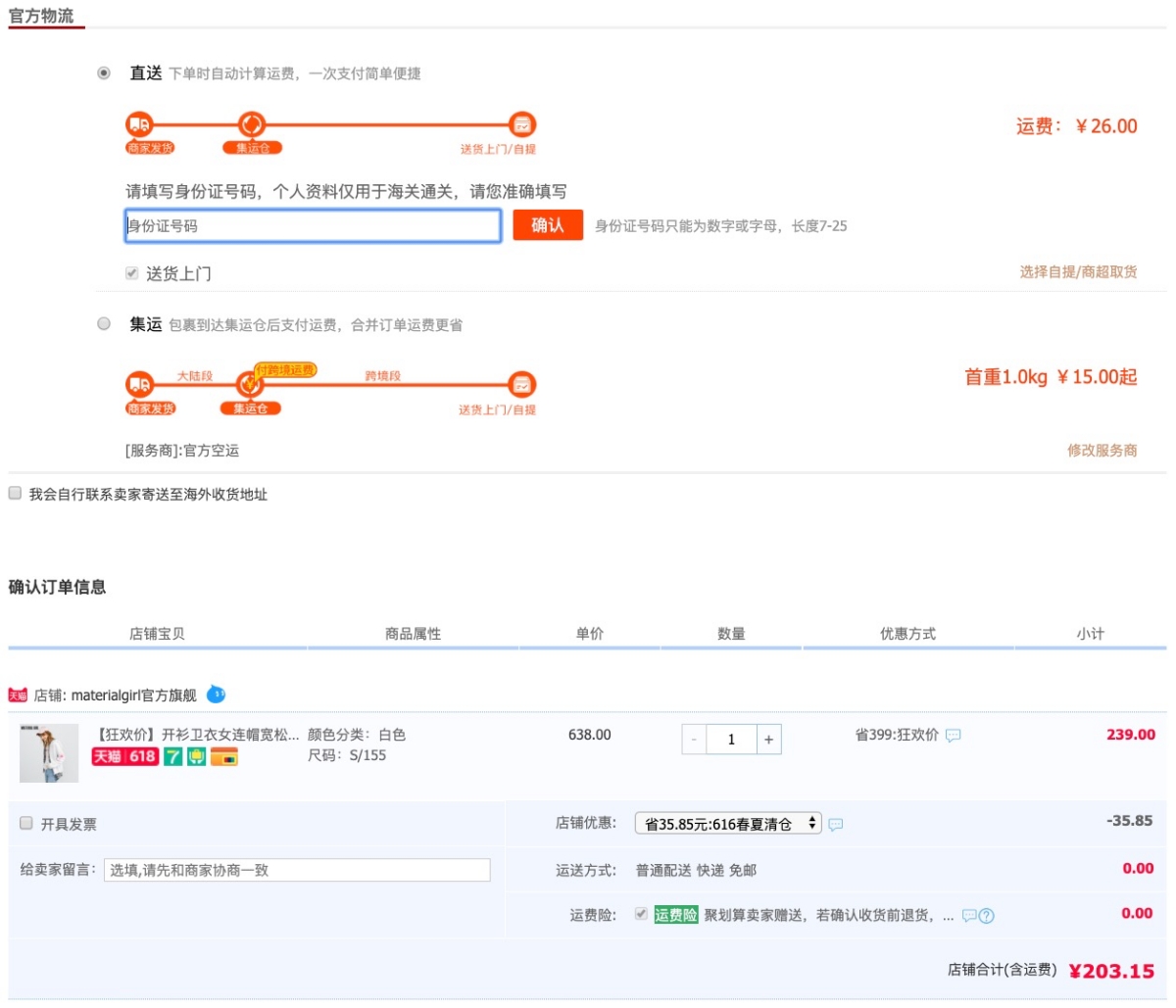 - 直送:並非所有商品都會出現這個選項,要看店家是否有設定好商品重量,有的話才會選的到,但如果有直送的話,你可以選擇後輸入身份證來看看運費會是多少,另外,直送有個好處是,結帳後就不用再做任何事情,等貨送達就可以了,也就是一條龍寄達。