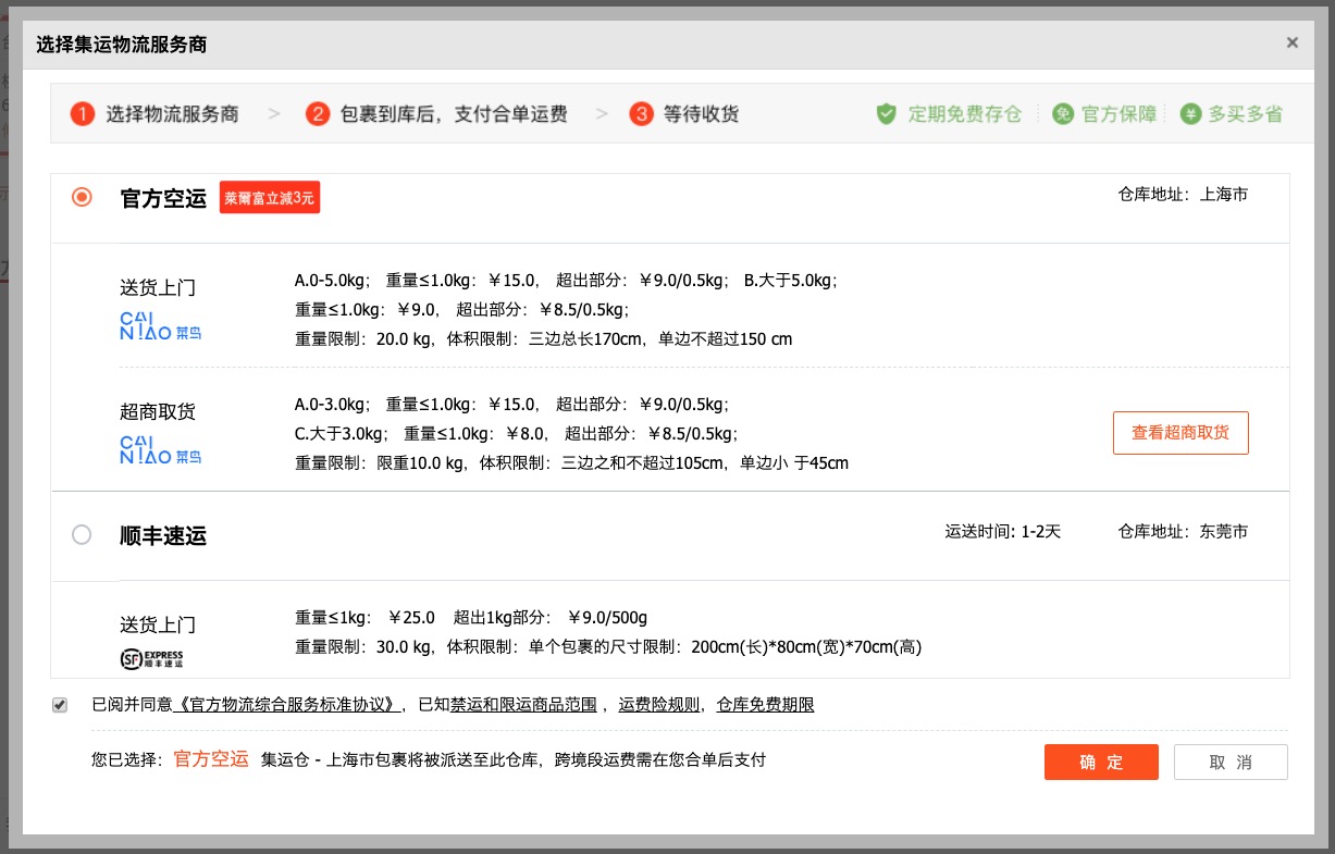 - 集運:一般來說,運費最便宜,如果你要買的商品是不同店家,那麼推薦你可以選擇集運,這麼一來,你可以等 A、B、C、D 店家的貨都寄到集運處後,再一次計算總重來結帳運費並統一寄出。
