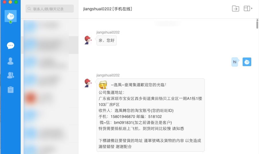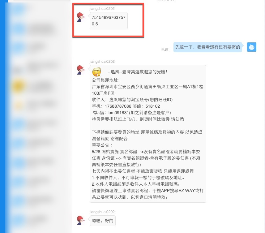 了解完阿湯使用的二家價格後,接下來,就是大家最想知道的,私人集運到底要怎麼用? 普遍私人集運可以區分幾種方式,透過淘寶的阿里旺旺私訊搞定、透過微信架接的系統搞定,或是其他方式我就不多介紹,大多是私訊或微信居多。 以阿湯自己最常使用的這二家空海運,都是透過私訊聯繫來完成,算是很簡單,往下我就用逸風國際轉運這一家私人集運來說明一下使用的流程。 步驟一:私訊給集運商(一樣是透過 APP 的客服或是電腦的阿里旺旺) 詢問他寄件資料,通常你會得到的地址就像這樣:
