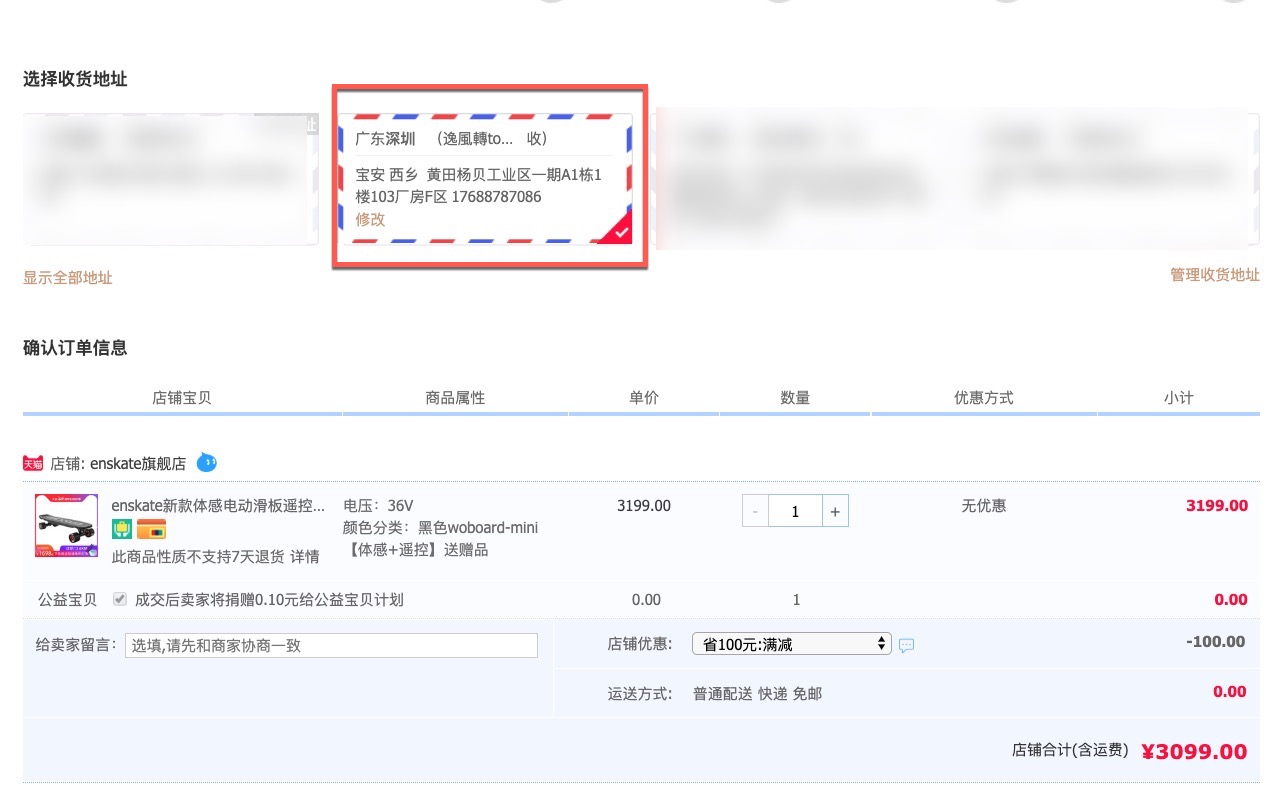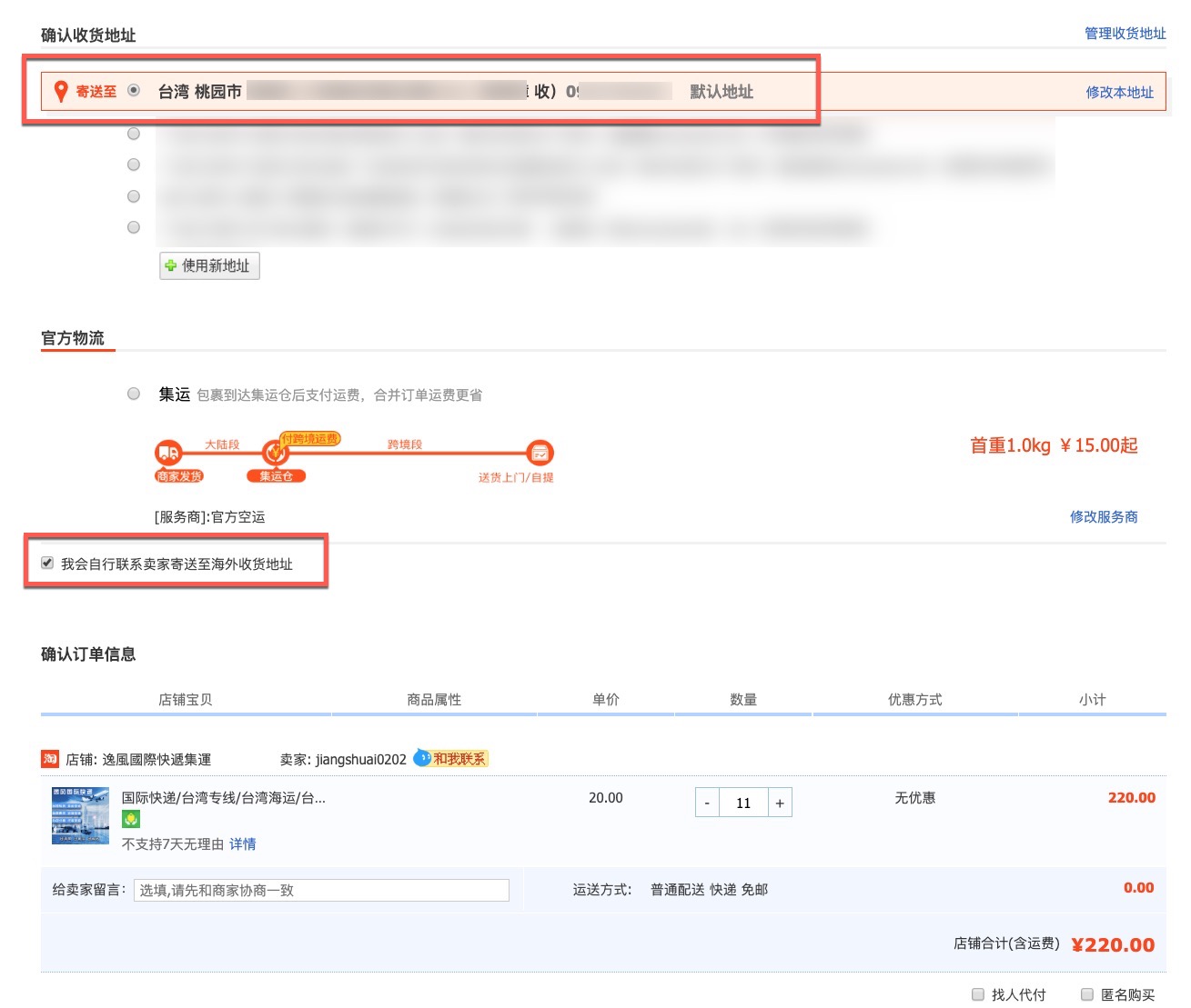 在下單的時候,將寄件資料填寫我們上一個步驟取得的資訊,然後就送出吧,淘寶上買的東西普遍都有包運費,所以國內這一段幾乎不會有額外費用產生。