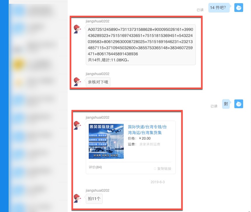 當你貨物都 OK 了之後,會請你核對一下全部的物流單號,看看有沒有少,以及全部重量為多少,像阿湯這單是 11.08kg,理論上是要算 12kg 的,大概是太常買,他只收我 11kg 的費用,集運商會給你一個淘寶的運費下單連結,你就透過該連結下單對應的數量,往下來看。