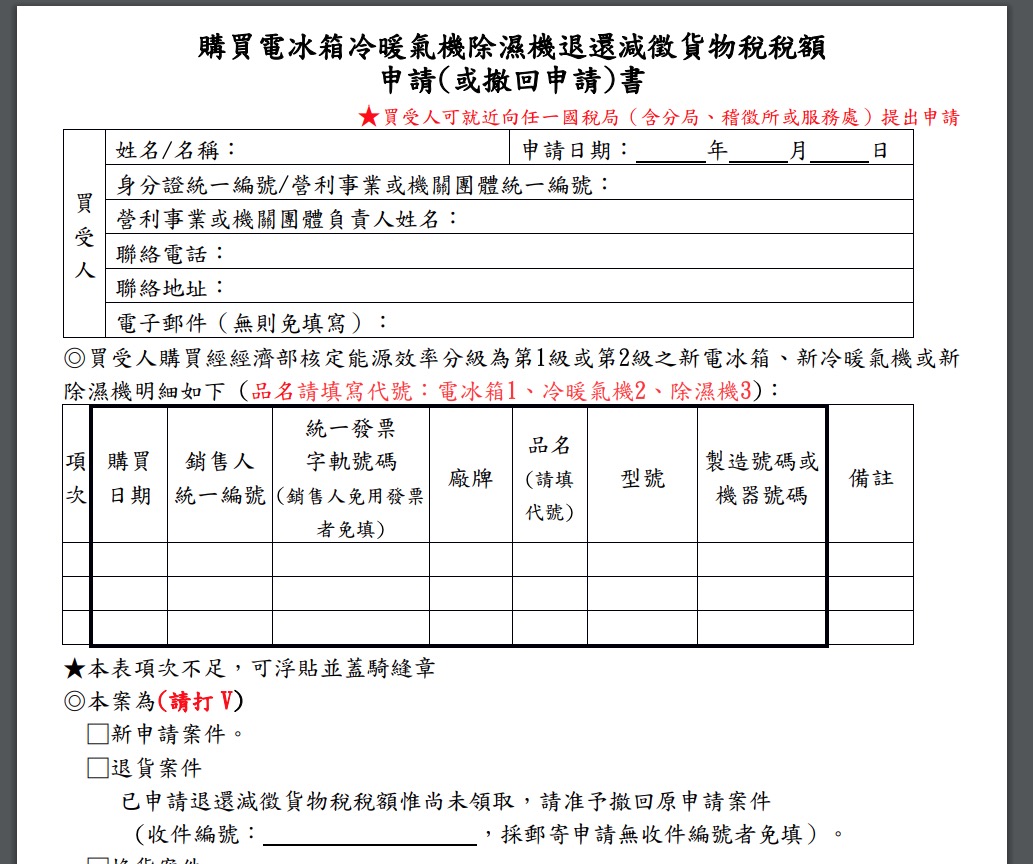 目前提供的家電退稅輔助分別有電冰箱、冷暖氣機及除濕機這三種,且需符合 1 級、2 級節能標章,就可以透過線上網頁或書面向國稅局申請。
