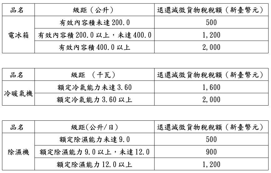而這三種家電的輔助款差異在於級距不同,可以領到的退稅額也有所不同,大家在購買時可以比對一下,就知道還可以退多少稅。
